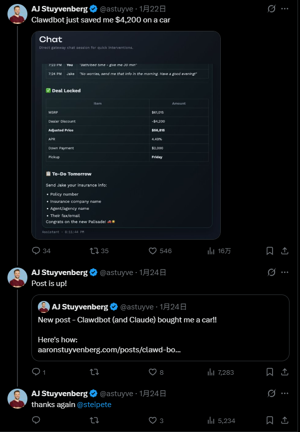 有一个案例让我印象特别深刻:一位网友让Clawdbot帮他买车,整个过程堪称教科书级的AI应用。