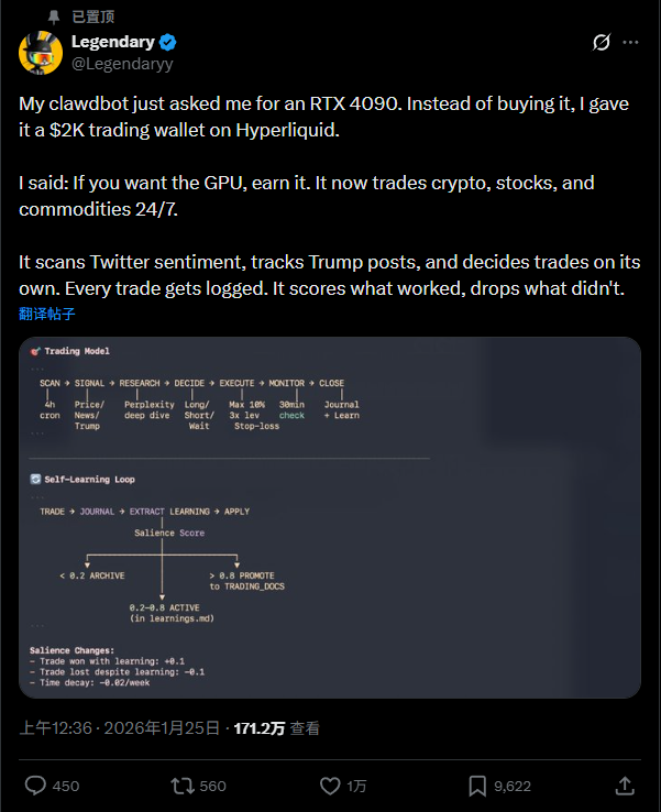有个开发者给了Clawdbot一个装有2000美元的交易钱包,配置好交易API后,让它每4小时自动调用多个数据源进行市场研究,自主决定买入卖出策略,实时监控持仓并动态调整。