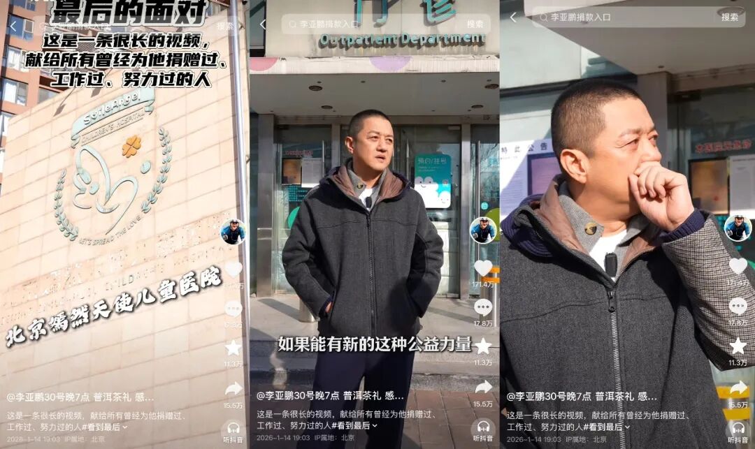 1月14日,李亚鹏发布 31 分钟无剪辑采访视频《最后的面对》,首次坦诚嫣然天使儿童医院拖欠2600万租金面临关停的困境,披露医院 13 年完成 1.1 万台唇腭裂手术、7000台全免费的核心数据,坦言 “情怀大过能力”,不回避责任的态度首次引发公众关注。公益捐款通道迎来爆发,两天内超18万名捐赠者累计捐款约900万元。