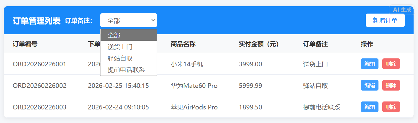 订单备注,可以将其理解为送货方式,系统使用枚举值,下单时选择规范数据。而实际的订单备注理解为附加内容,需要用户自主填写,数据值为自填纯文本。
