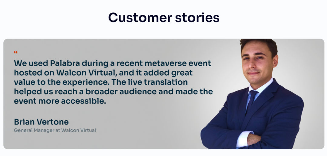 我发现 Palabra AI 在不同行业的应用展现出了令人印象深刻的深度和广度。在活动和会议领域,他们已经成功处理了各种复杂场景,从小型商务会议到大型国际会议都能胜任。特别是在虚拟现实会议中的应用让我感到惊讶——参与者可以在虚拟现实环境中参加会议,选择与其他参与者交流的语言,以及观看主要演示的语言。有趣的是,他们提到的一个案例是关于农业的会议,参与者在虚拟现实中讨论牛的相关话题,同时享受实时翻译服务。