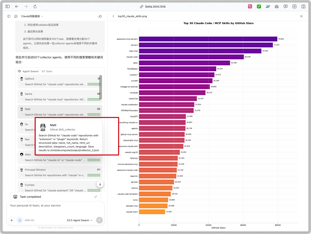 而Kimi 2.5的Agent 集群,是第三阶段,让AI 学会了像团队一样分工协作。每次我提出一个新项目,Kimi就会为我组建一个临时的专家团队。