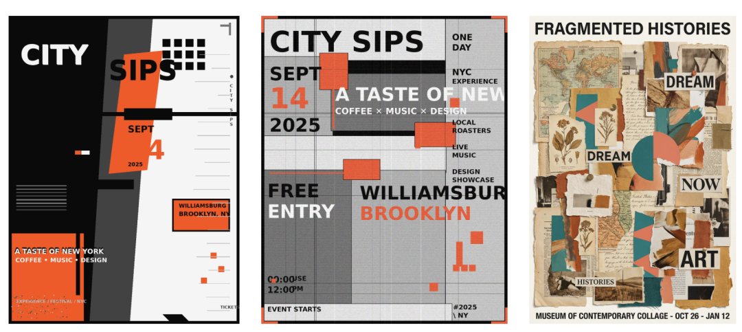 风格覆盖要足够广,包含但不限于:粗野主义、街头涂鸦、复古纽约、极简主义、霓虹风、拼贴、超现实。