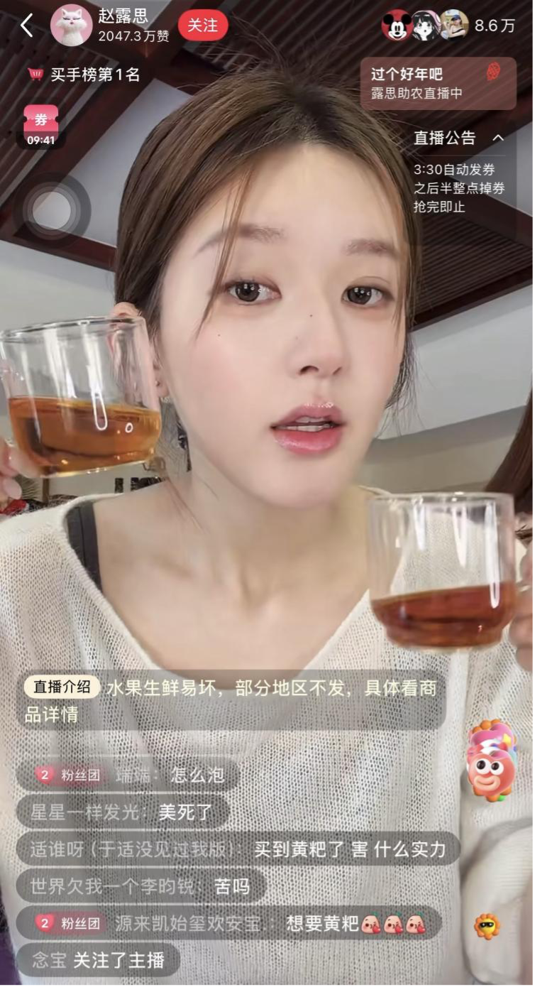 很快,这款葛根茶迅速被卖爆了,直播后月销量立刻增至数千,该款葛根茶品牌的负责人透露,赵露思直播当天的订单量是他们过去七八年的总和。