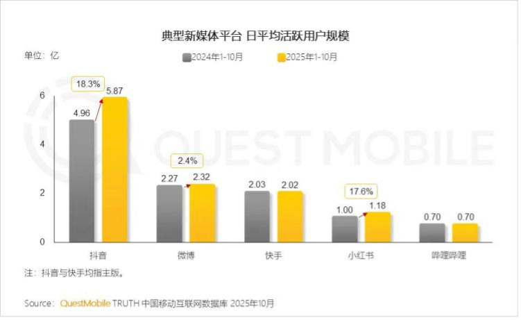 QuestMobile 2025年10月数据显示,抖音、快手、微博、小红书、B站五大平台去重月活已达11.49亿,覆盖中国移动互联网核心人群,基本呈现一种零和竞争的态势。