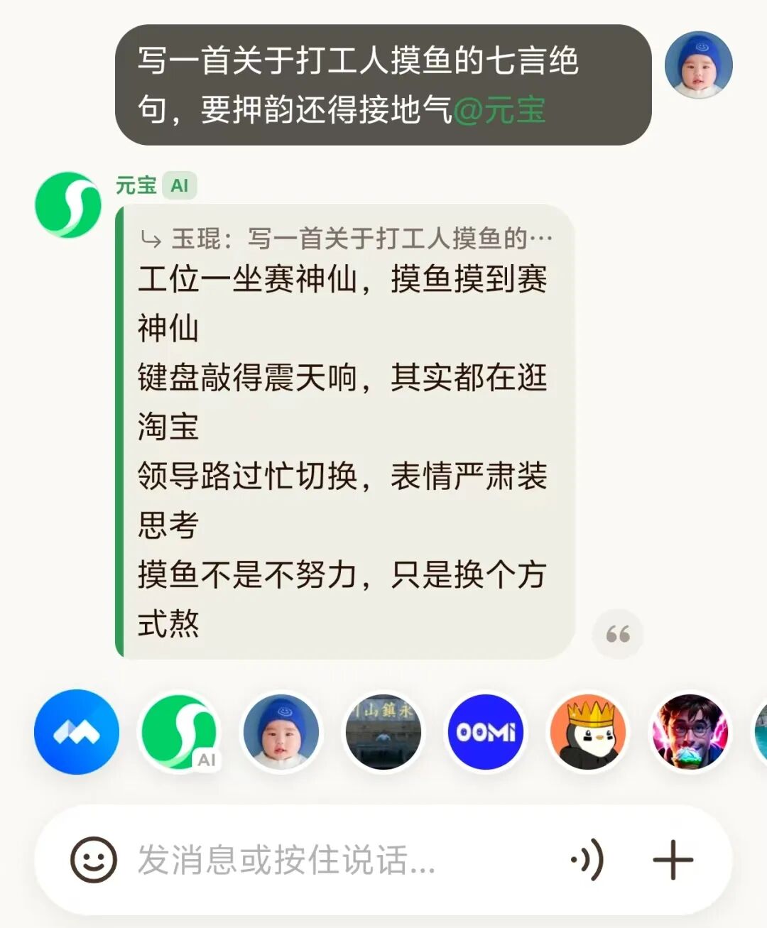 想玩文字梗?在“搞笑创作派”里@元宝“写一首关于打工人摸鱼的七言绝句,要押韵还得接地气”,它秒回“键盘敲得震天响,其实都在逛淘宝……”,瞬间点燃群里的创作欲。