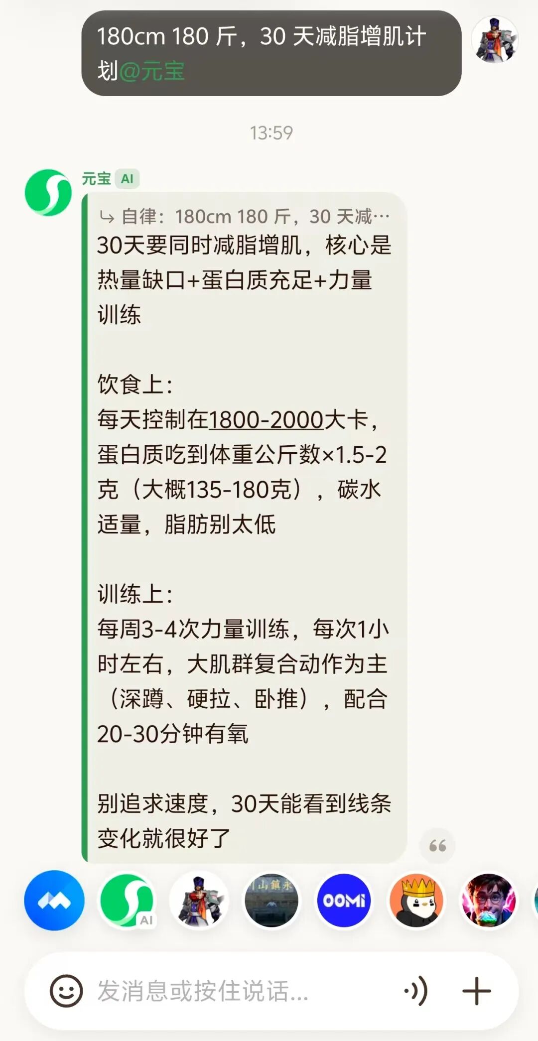 健身党@元宝 “180cm180斤,30天减脂增肌计划”,它会详细规划饮食、训练方案(每周3-4次力量训练),还能设置每日打卡提醒,谁偷懒没运动都会被它“点名”。