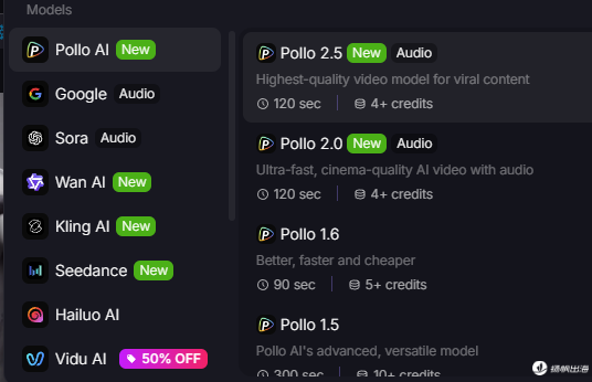 最初,Pollo AI可以说走的是一个“聚合模型”的路线,接入了Sora、Midjourney、Vidu、Hailuo、Kling等市面上大部分的顶级模型,且对每个模型的优势进行了说明,便于用户根据需求有针对性地选择。朱陈彪曾表示由于资金和竞争问题,暂不考虑自研模型。不过,在平台最新版本中发现,其自研新模型Pollo 2.0、Pollo 2.5已被接入,主打超高速、高质量视频生成。