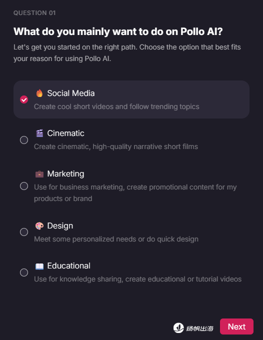 在内容创作前,用户需要做一次调查问卷,题目很简单,包括创作的目的用途、偏好、方式以及个人的年龄、性别和角色。创作的过程和内容也会根据问卷结果进行调整,这是大部分产品中都少见的,同时也是SEO思维的一种应用。具体而言,用户体验优化是影响SEO的核心要素,而Pollo AI用几秒钟的简单问卷,就实现了这一过程。