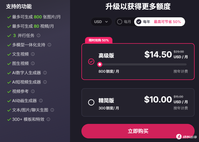据官方数据显示,Pollo AI月订阅15美元,年订阅120美元(折合10美元/月)。高级版月订阅29美元,年订阅174美元(折合14.5美元/月),相当在月订阅的基础上优惠了50%。