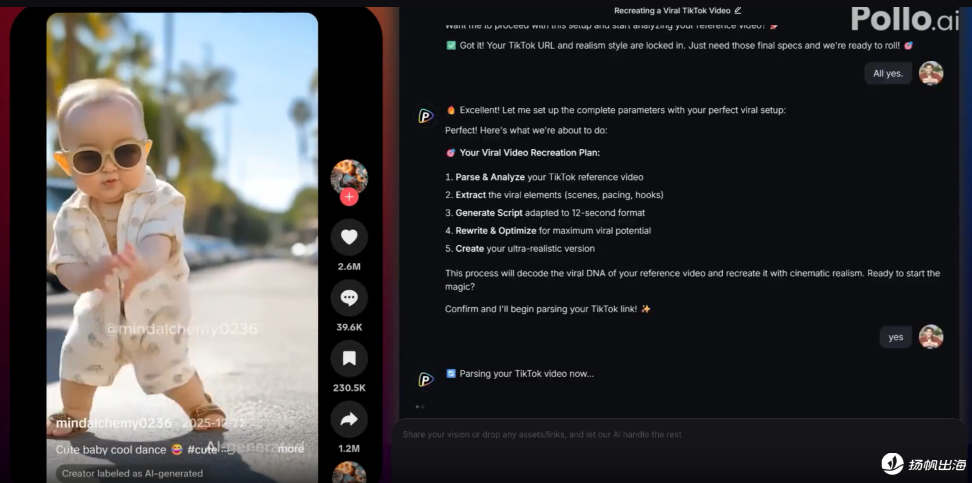 当前,Pollo AI的AI Agent功能还在筹备阶段,从其预告宣传上看,是想打造出一个仅通过对话或链接复制就能进行创作的模式,AI会记住创作思路、微调内容,甚至解析一段爆款视频的吸睛亮点、叙事节奏和内容结构,不仅能自动生成内容,还能提供建议和灵感。