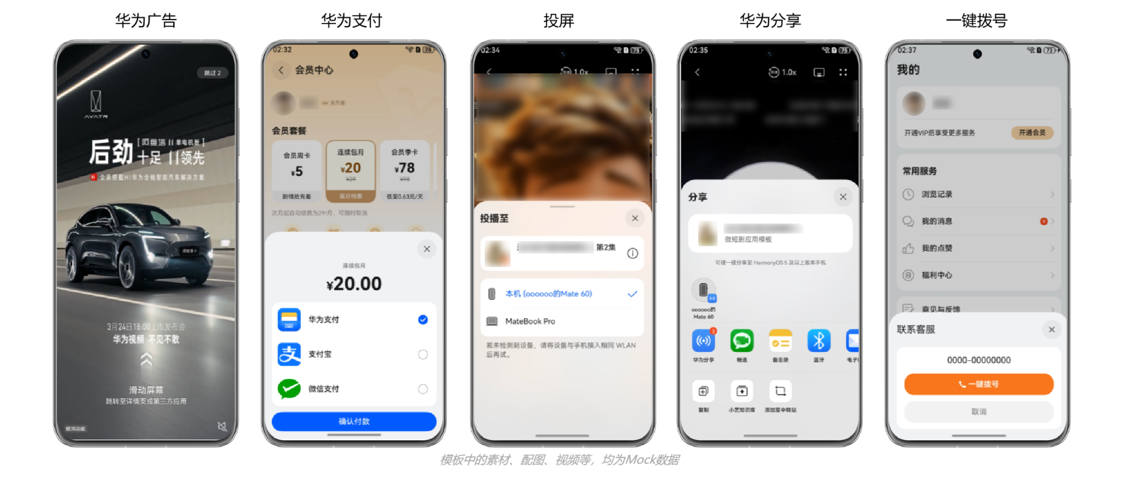 - 鸿蒙能力接入:华为账号、华为推送、华为分享、实物商品收银台、多设备适配;