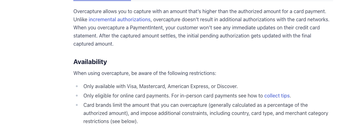 Stripe这里面也说明了Over Capture和Incremental Authorization的差别就在于不需要再做一次授权。