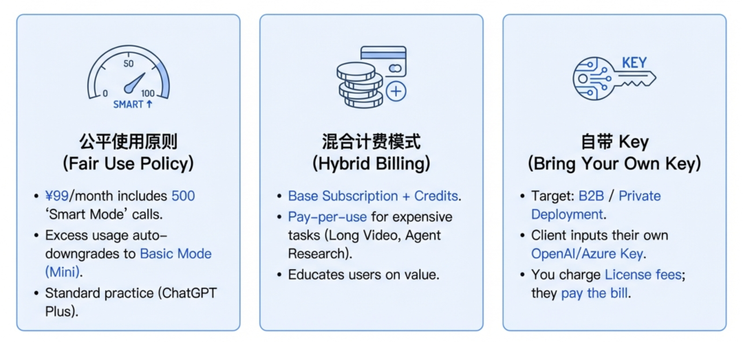 让企业客户填入他们自己的 OpenAI 或 Azure Key。你只收软件服务费(License),Token 消耗让他们自己和微软结算去。这直接甩掉了成本包袱。