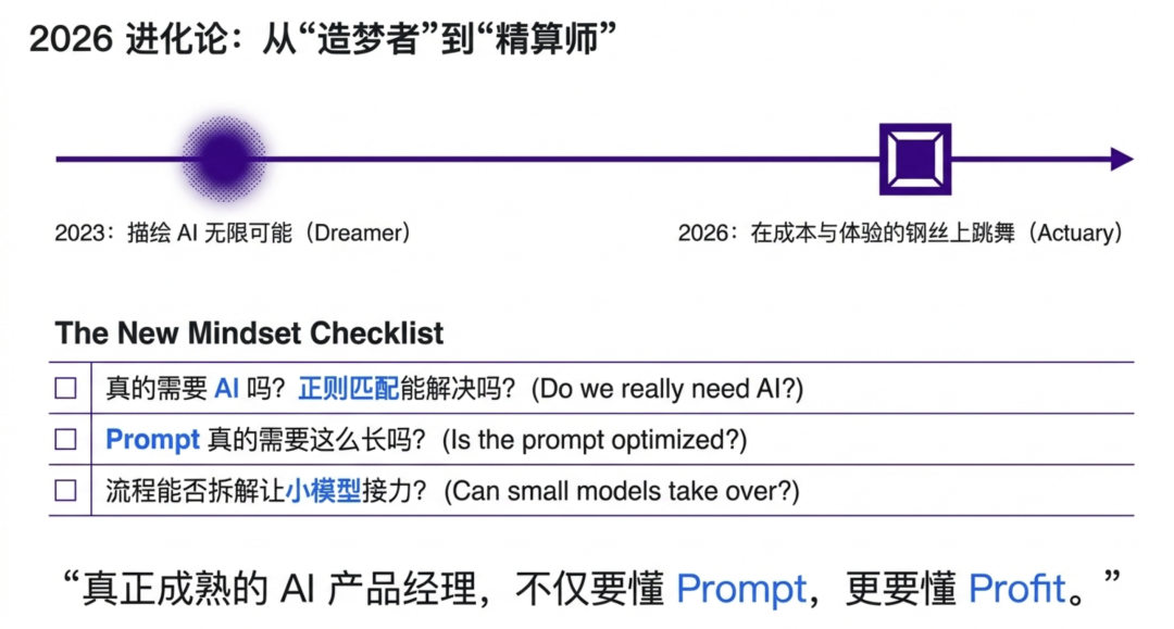 2023 年,我们是“造梦者”,描绘 AI 的无限可能;2026 年,我们必须变成“精算师”,在成本与体验的钢丝上跳舞。真正成熟的 AI 产品经理,不仅要懂 Prompt,更要懂 Profit。