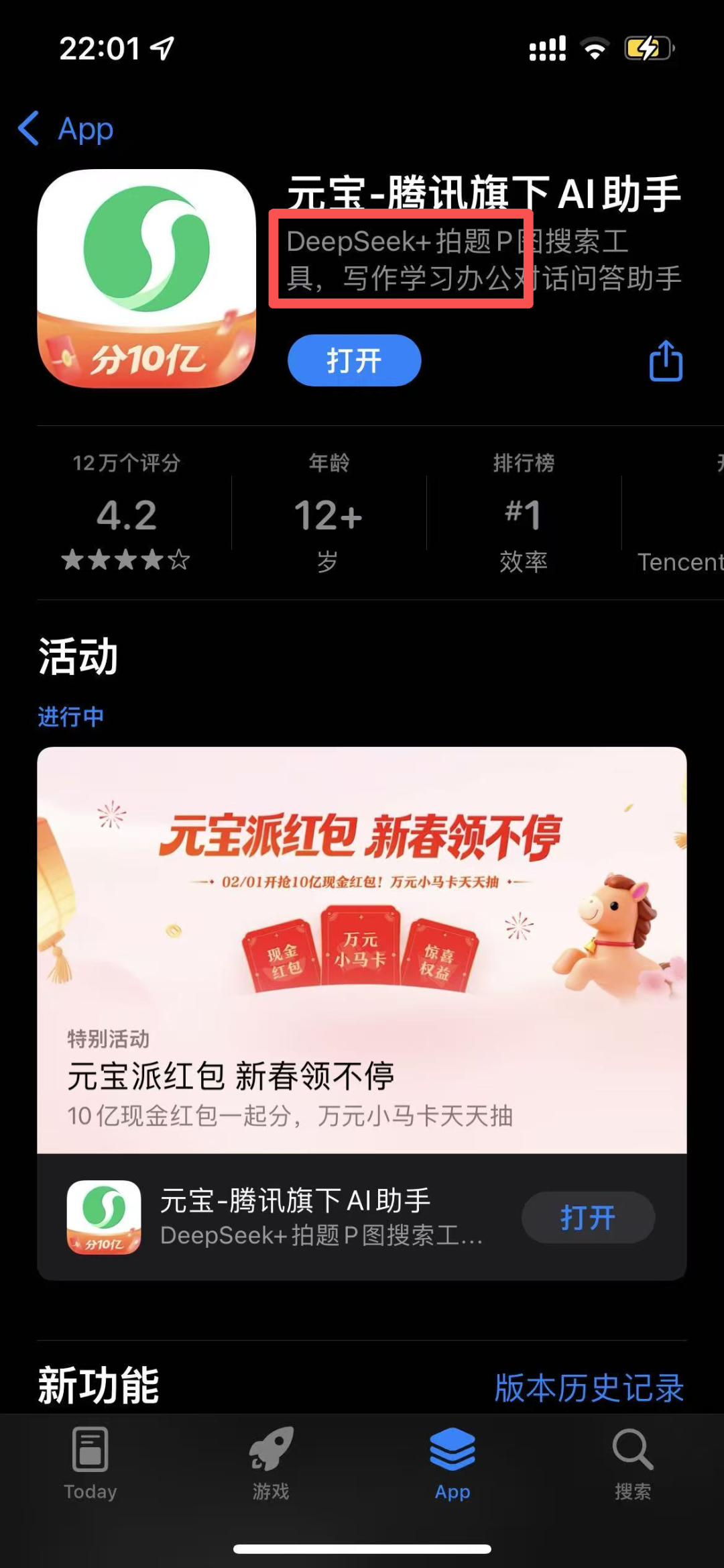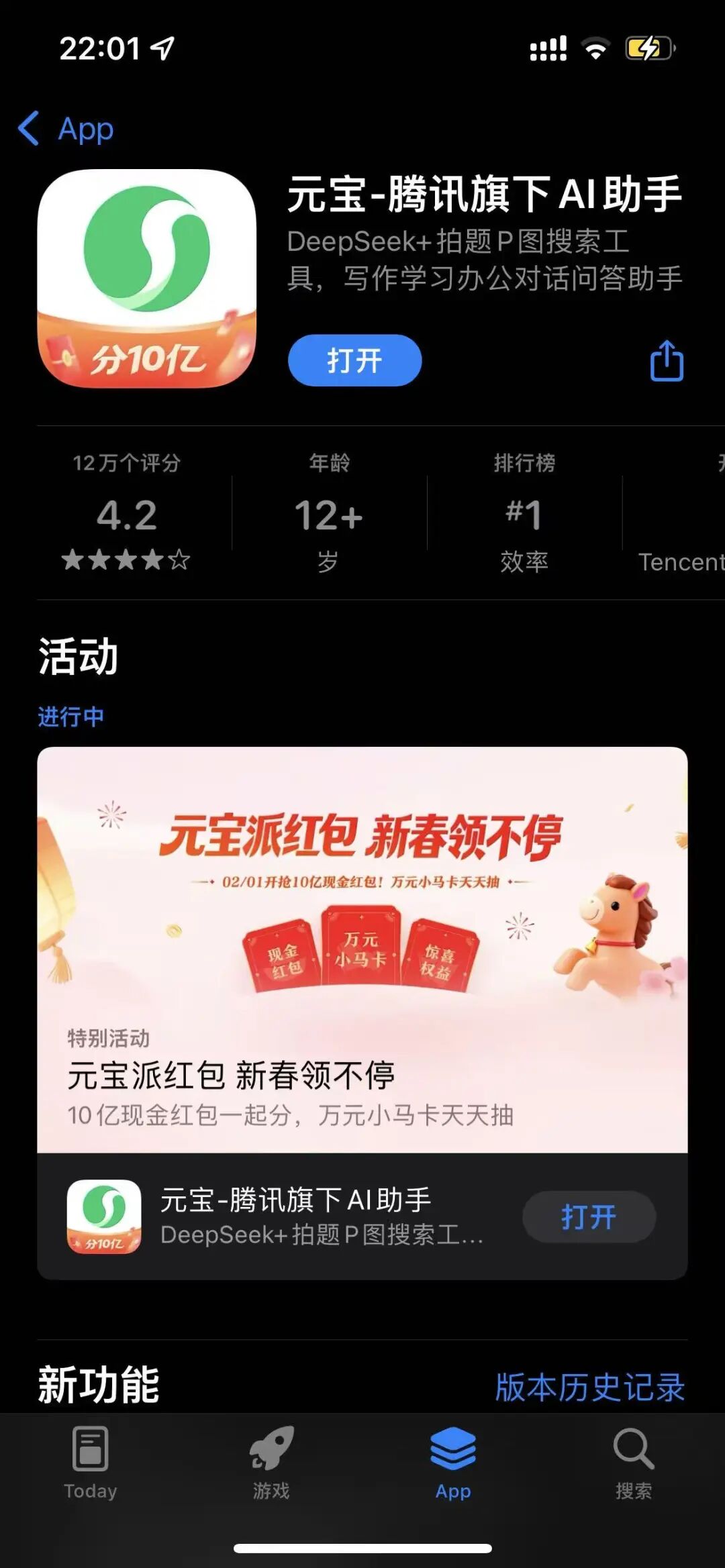 2月2日,APP store的免费APP排行,第一名就是元宝。