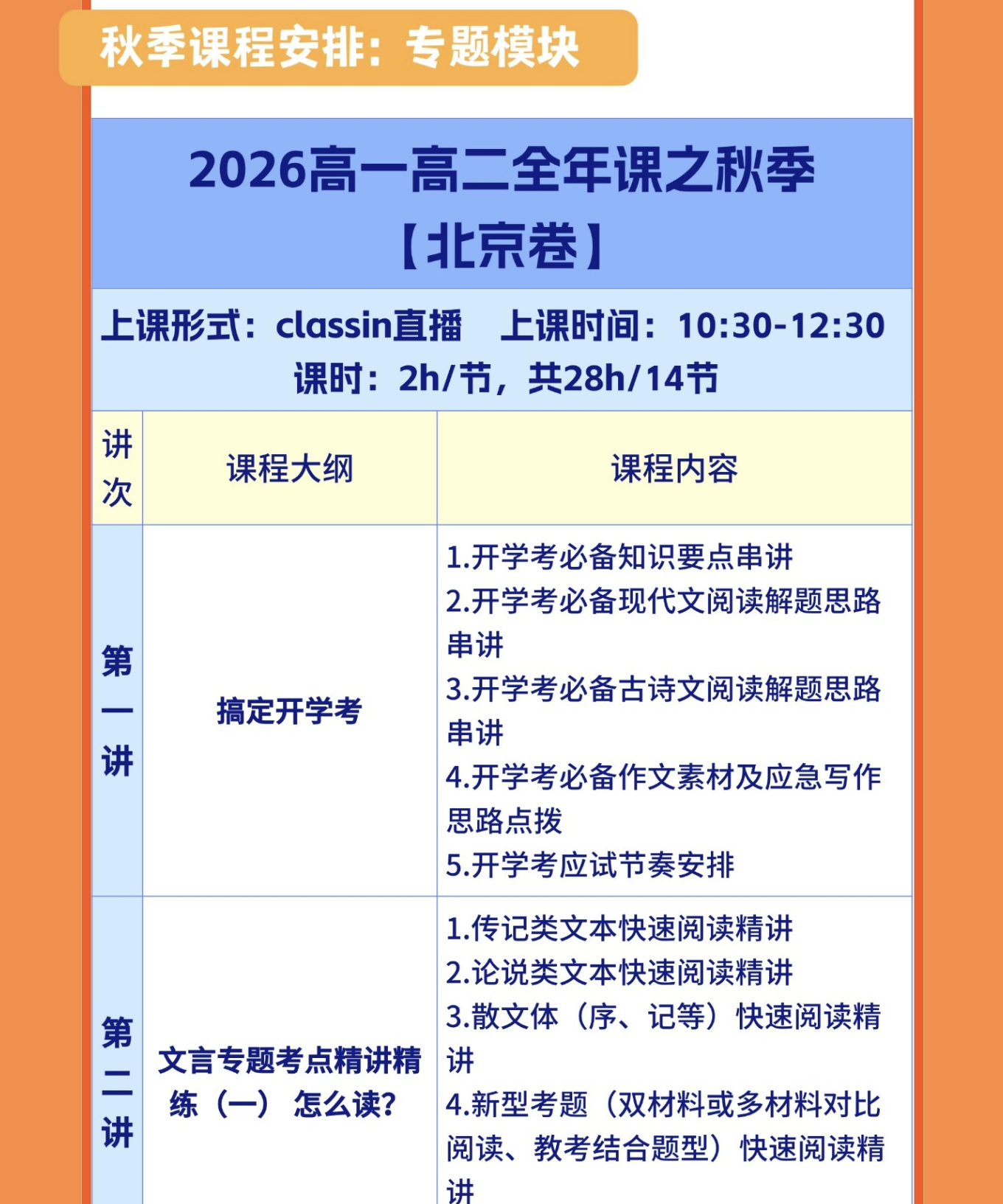 秋季课程安排:2026高一高二全年课之秋季【北京卷】,上课时间:10:30-12:30,课时2h/节,内容:专题模块