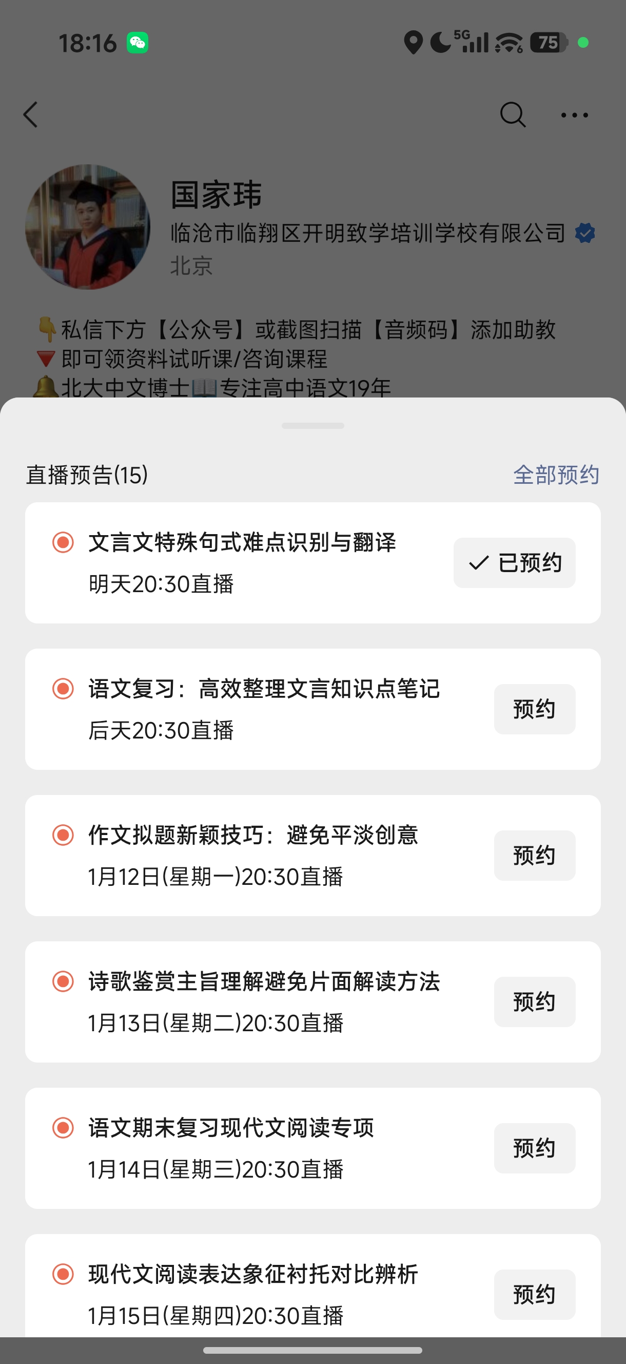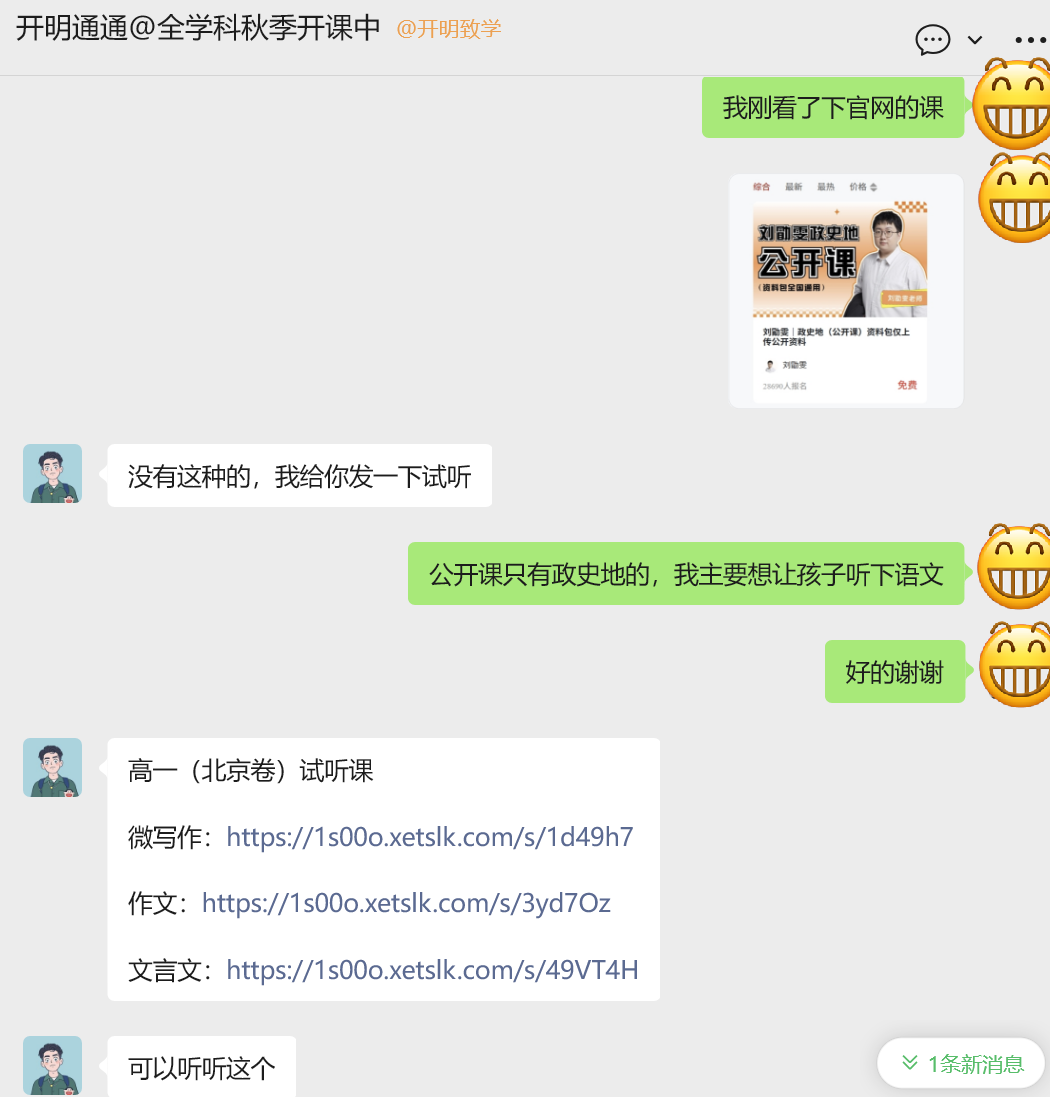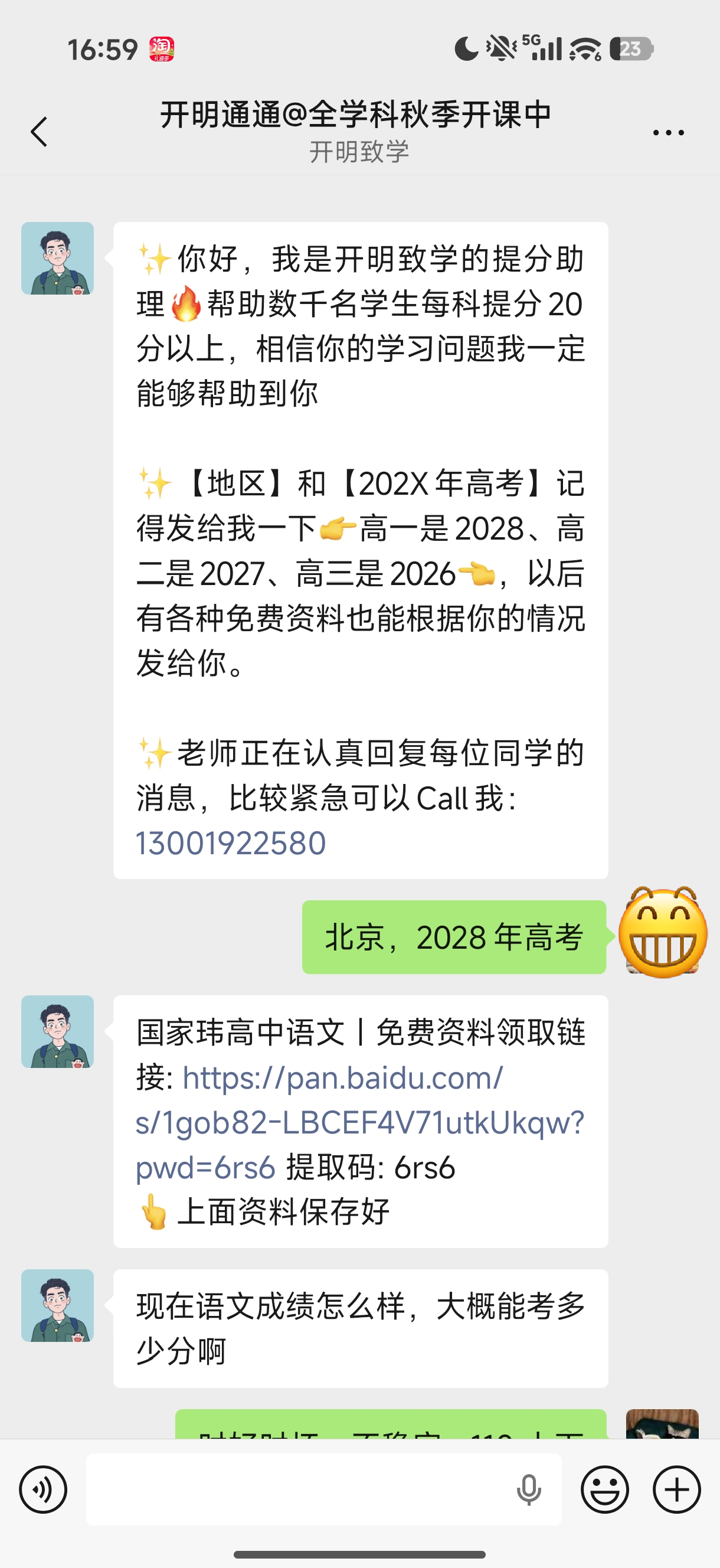 私域:1v1场景,首联话术以给情绪价值+收集信息(城市-哪年高考),然后发放见面礼福利资料,值得借鉴的是,结尾会留下助教个人手机号,可以增加真人亲近感。给完资料后,还会进一步沟通建联,了解当前成绩现状,并且给到IP本人背景信息介绍(可能是识别后台是0标签的新用户),物料方面有:国老师头衔海报图、最新的系统课课表、配套服务、招生简章。