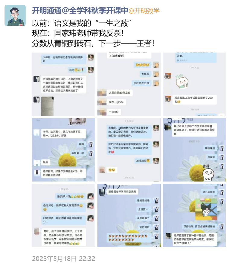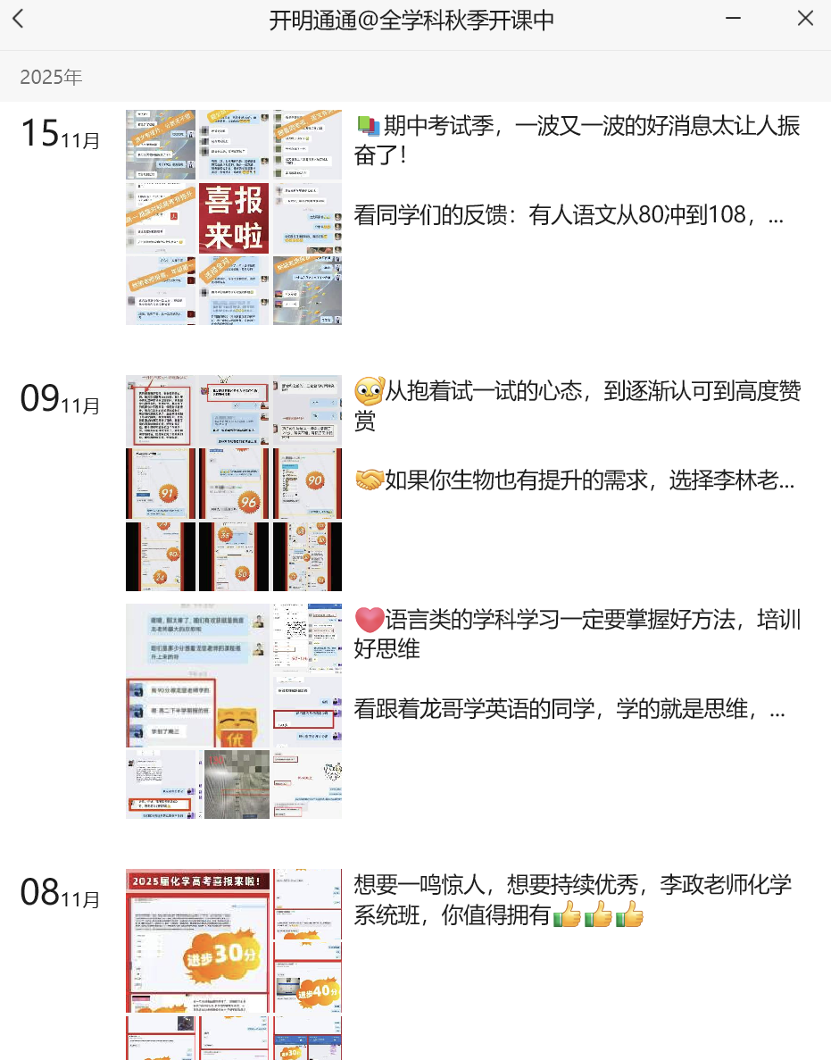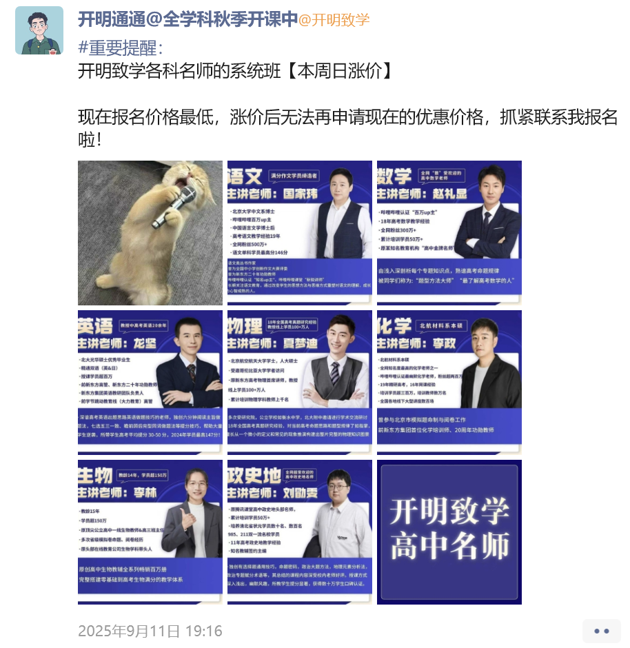 【课程产品体系成熟很垂很刚需】26年刚一周,就已经把全年的课程规划、大纲、课表安排都提前规划好了,从寒春联报、暑期班、秋季班,课程体系非常全面,包括新高一&高二多学科组合联报价格等等,成熟的产品体系和定价策略,一方面能清晰直观的让家长了解到除了买语文,还可以买其他课程,给业务增加扩科的多品GMV埋下铺垫(而且其他IP也基本上是B站百万UP级别的,这个公司一开始以B站流量起家);另一方面私域也会隔三差五晒其他IP学员提分成果展示,强化用户对以国老师为标杆其他主讲老师也同样优秀,不断锚定【提分】这个核心痛点。