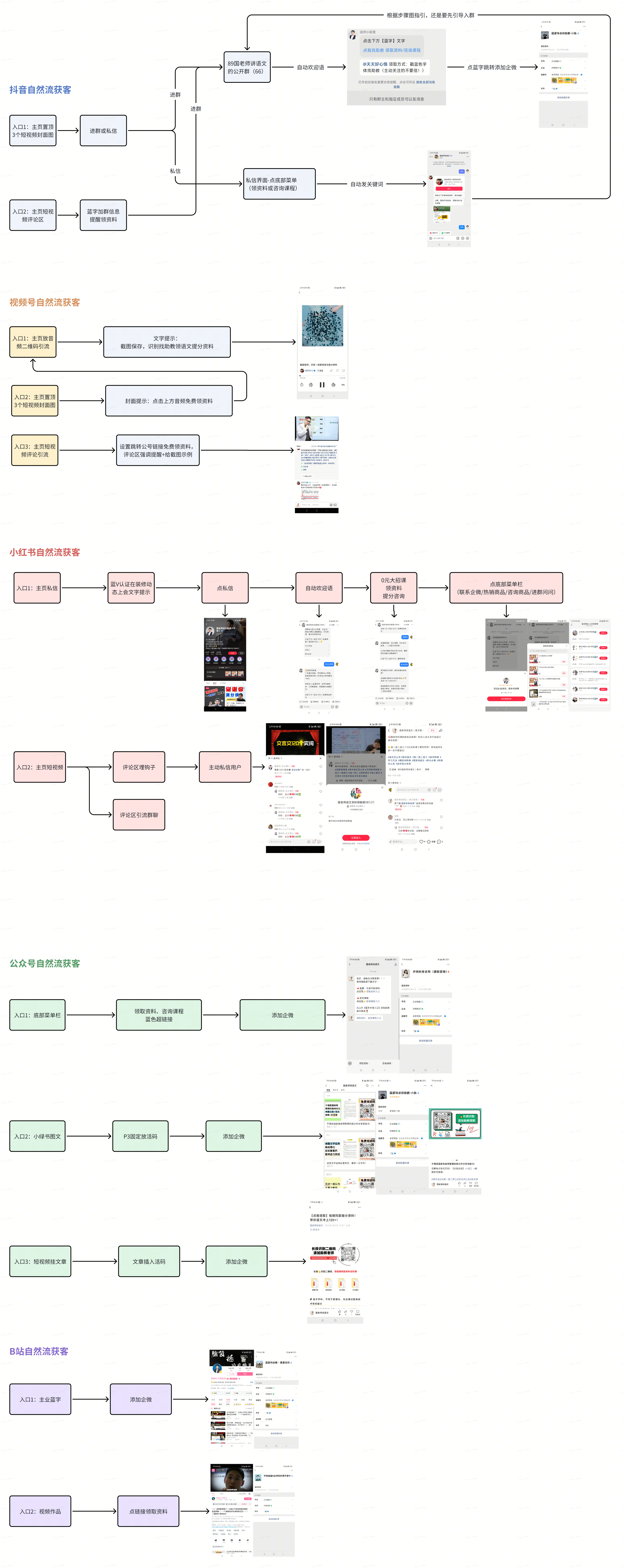 总的来说,“国老师讲语文”以国家玮本人为背书,通过资料内容为主要的引流钩子,基本上把所有能触及的入口全部配置了,珍惜每一个线索都精准无误进入企微。在各个公域平台实现一鱼多吃,把公域主要当成了引流获客的主阵地,大部分成交集中在私域变现。体现在私域的课程咨询(销售型)、助教老师(课程服务型),在不同公域引流时会根据不同钩子和受众,分流给不同的后端角色来承接。因调研工具有限,更多是以自然流+企微获客助手打通了公私域引流合规化,这里咱不拆解投流型获客方式,本篇主要拆解公转私引流获客到私域高价值成交的完整闭环路径。