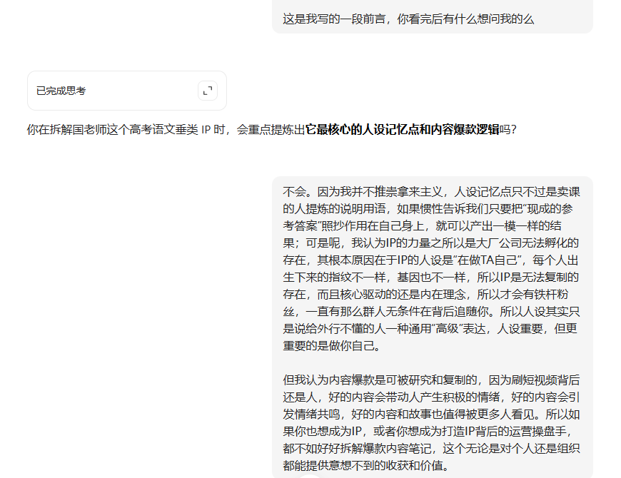 打字打到这句话,我让AI结合我前面发的前言问它有什么想要问我的。豆包向我提问说:“你在拆解国老师这个高考语文垂类IP时,会重点提炼出它最核心的人设记忆点和内容爆款逻辑吗?”。有意思的是,它还知道加粗重点,下面正文是我的回复: