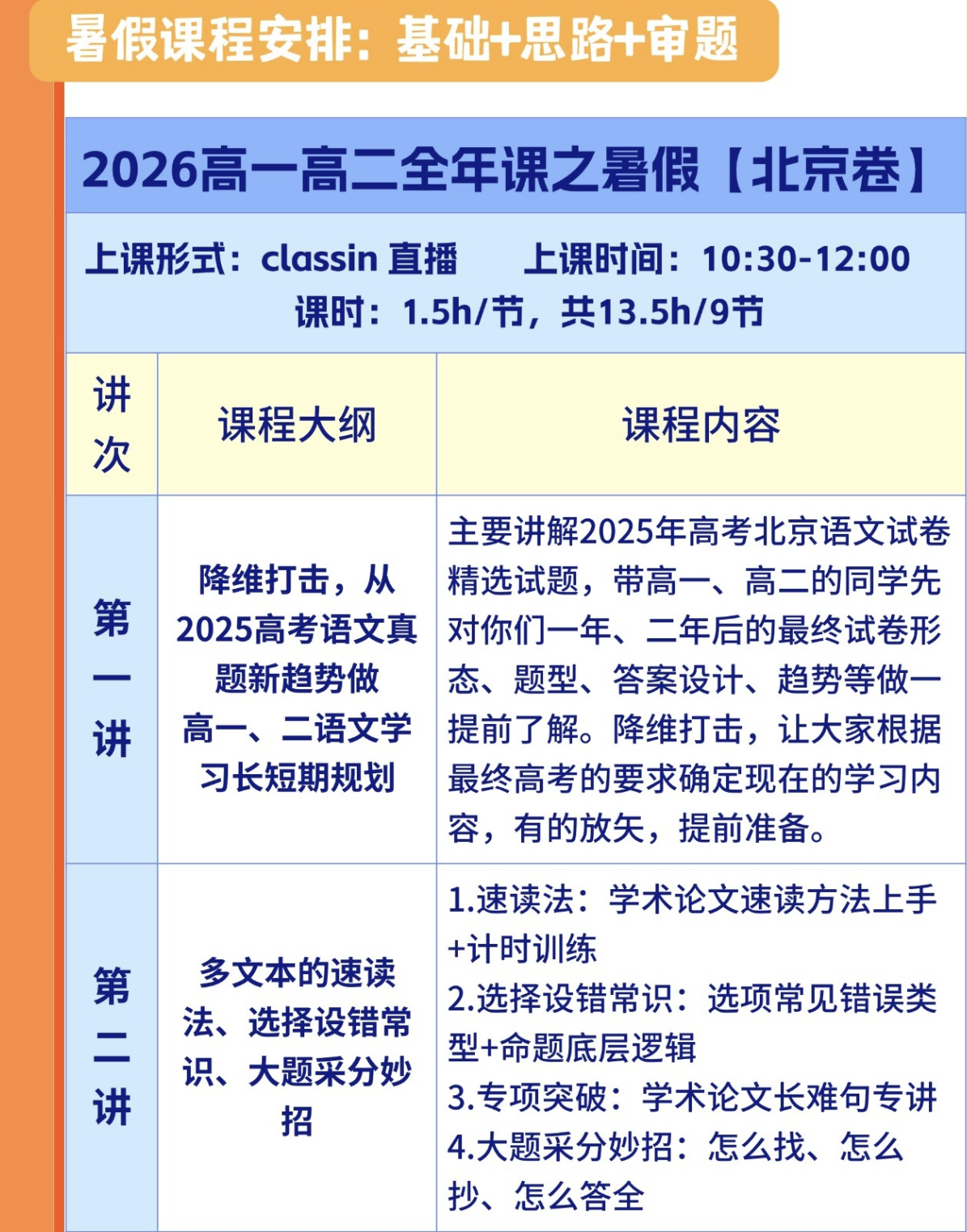 暑假课程安排:2026高一高二全年课之暑假【北京卷】,上课时间:10:30-12:00,课时1.5h/节,内容:基础+思路+审题