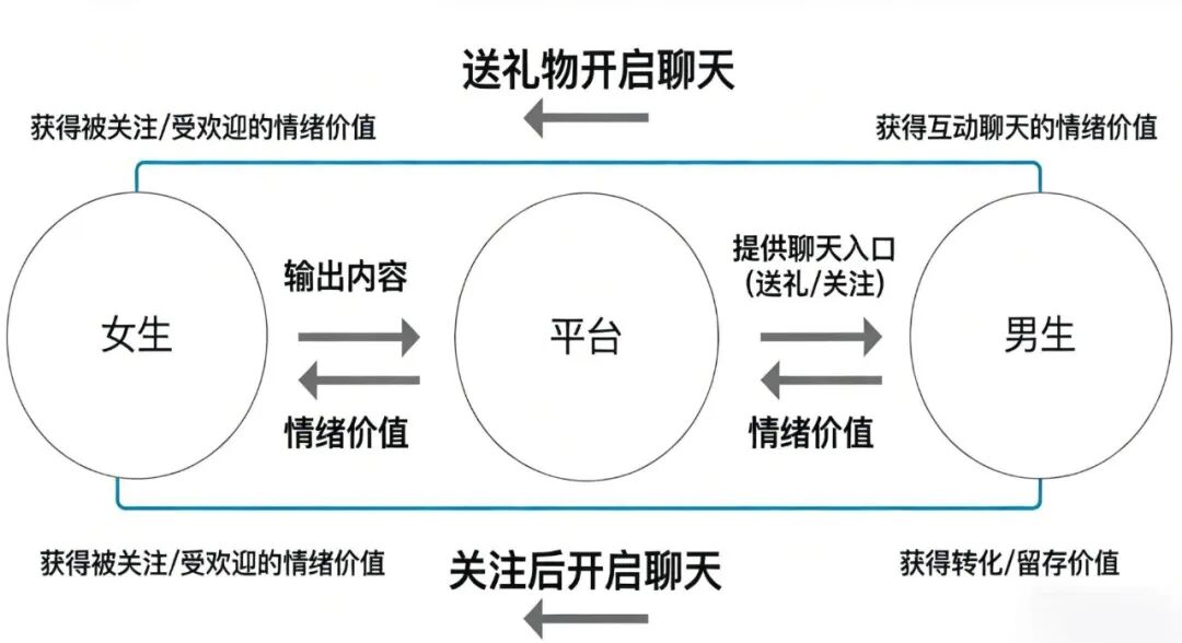 要我是平台:通过“要么花钱聊天,要么接受关系绑定”的二选一机制,用极低成本完成了关系沉淀,大部分流量是流入「关注后聊天」的入口,对产品来说,直接有效拉升有效聊天率、互动率、转化率等核心指标。
