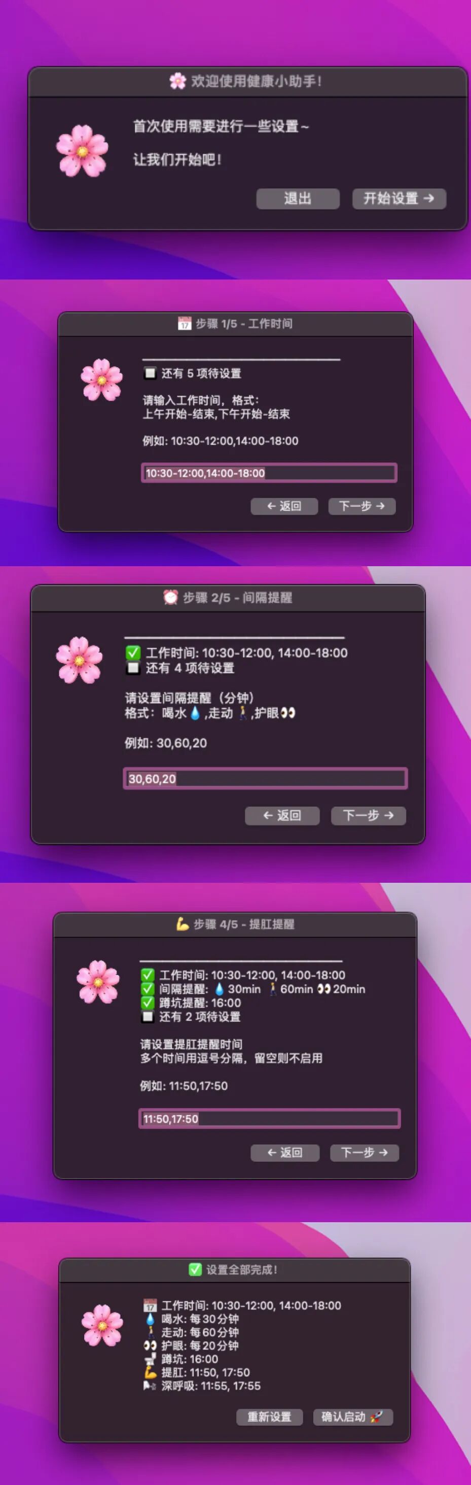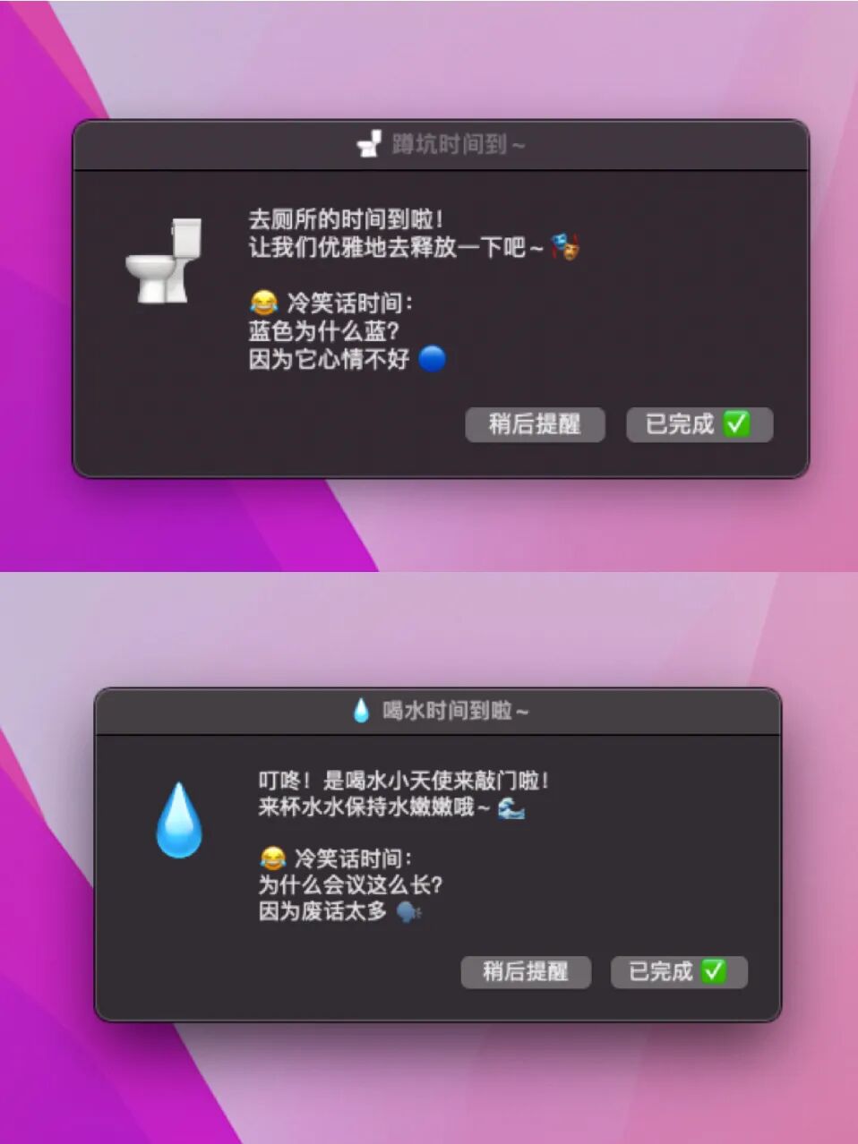 作为非技术出身的产品,一直想做几个贴合自己需求的轻量小工具,却苦于跨端调试、接口开发的繁琐,这次试着用它做了两个小玩意:一个是Mac端的健康助手,会定时弹窗提醒喝水、揉眼睛、起身活动,把日常容易忽略的健康细节落地;