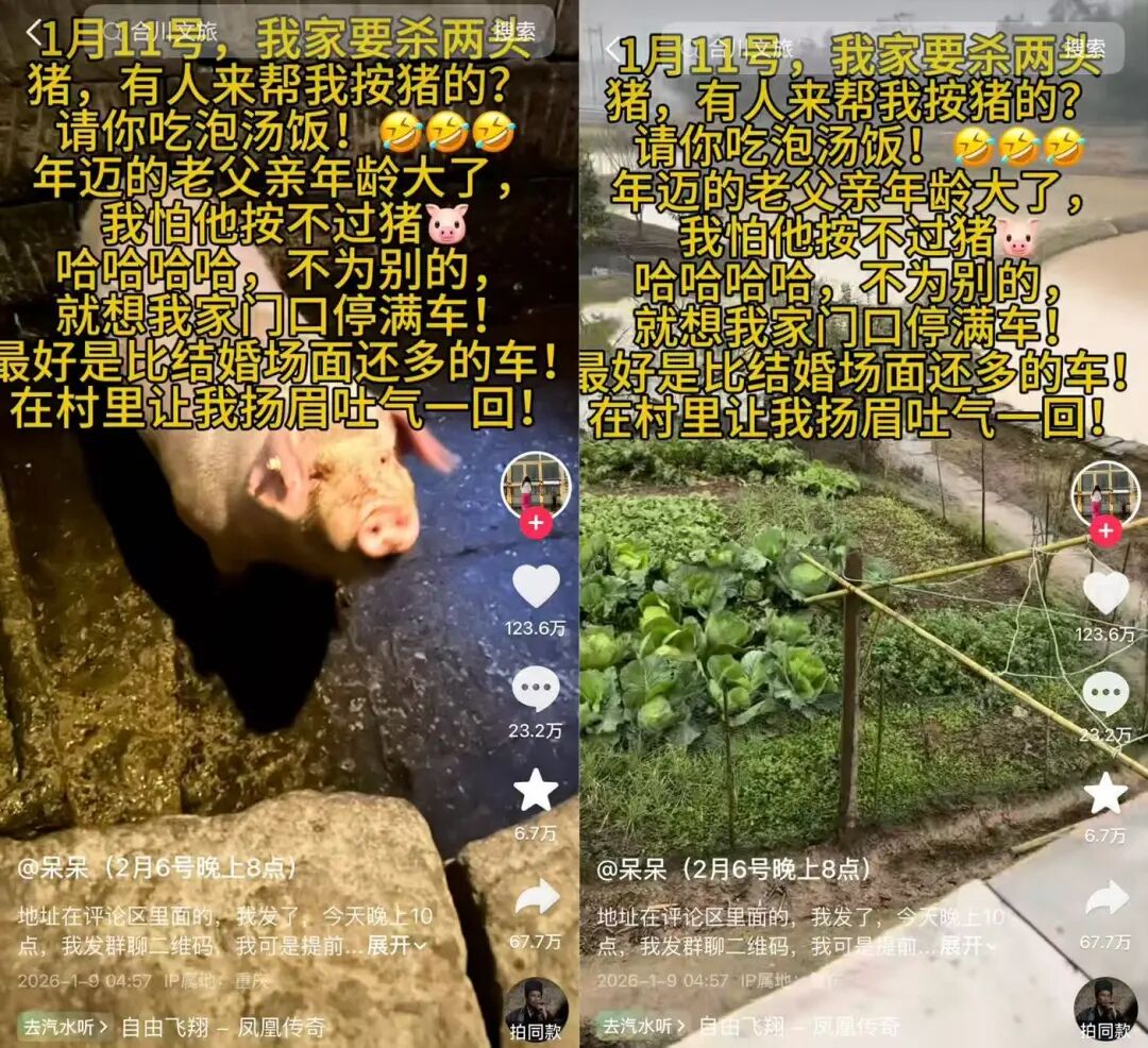 该素人爆火的起源来自于一条普通的求助视频。1月9日,重庆合川女孩@呆呆 发布视频称:“1月11日我家要杀两头猪,有人来帮我按猪吗?年迈的老父亲年龄大了,我怕他按不过猪。不为别的,就想我家门口停满车,最好是比结婚场面还多的车!在村里让我扬眉吐气一回!”发完视频,还麻溜地在评论区附上了自家地址。