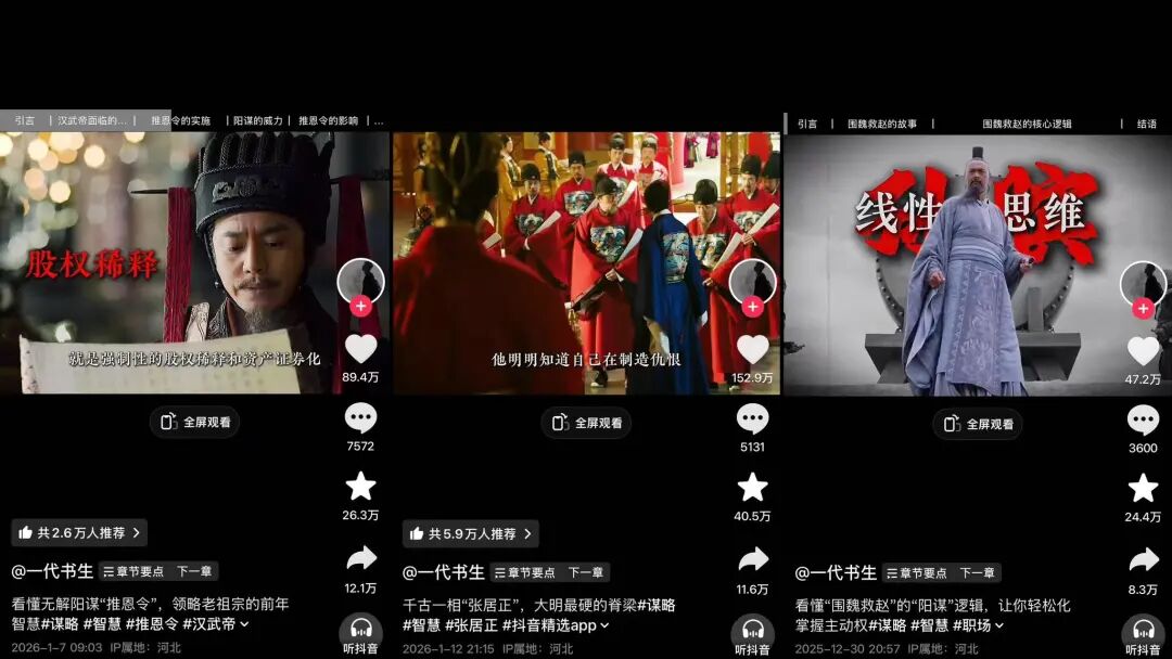其内容的最大特色就是将历史知识与当代的职场权谋深度绑定,一边严谨拆解历史事件、剖析人物博弈逻辑,一边以“职场视角”重构历史解读,聚焦历史中的朝堂博弈、派系纷争、人际相处等场景,拆解其中的权衡之术、沟通技巧等,再精准对照当代职场的协作、人际沟通、利益权衡等核心痛点,给出可落地的解决方法。通过这种独特的结合方式,历史不再是遥远的过往,而是成为可借鉴的“职场生存指南”,既满足了用户的知识获取需求,又实现了内容的实用价值落地,这也是账号能持续吸引用户、快速涨粉的重要支撑。