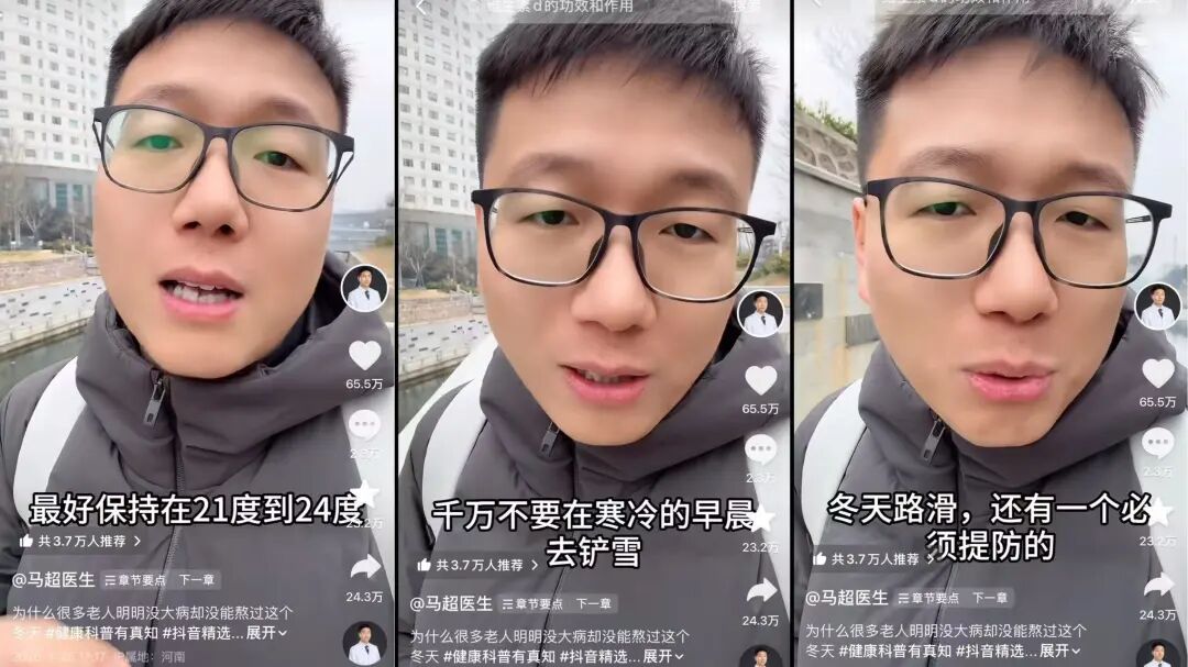 据观测,其1月25日发布的一条《为什么很多老人明明没大病,却没能熬过这个冬天》的视频,详细拆解了“一到冬天,老年人离世人数比平时多出一截”背后的多重原因,并针对性提出了各种有效建议,如将居室温度控制在21度到24度、不要在寒冷的早晨去铲雪、家里的湿度要保持在40%到60%、做好防滑、多陪伴父母以增强他们的“心理免疫力”等。这条实用性极强的视频收获65.5W点赞,也为@马超医生 带去了更多关注。