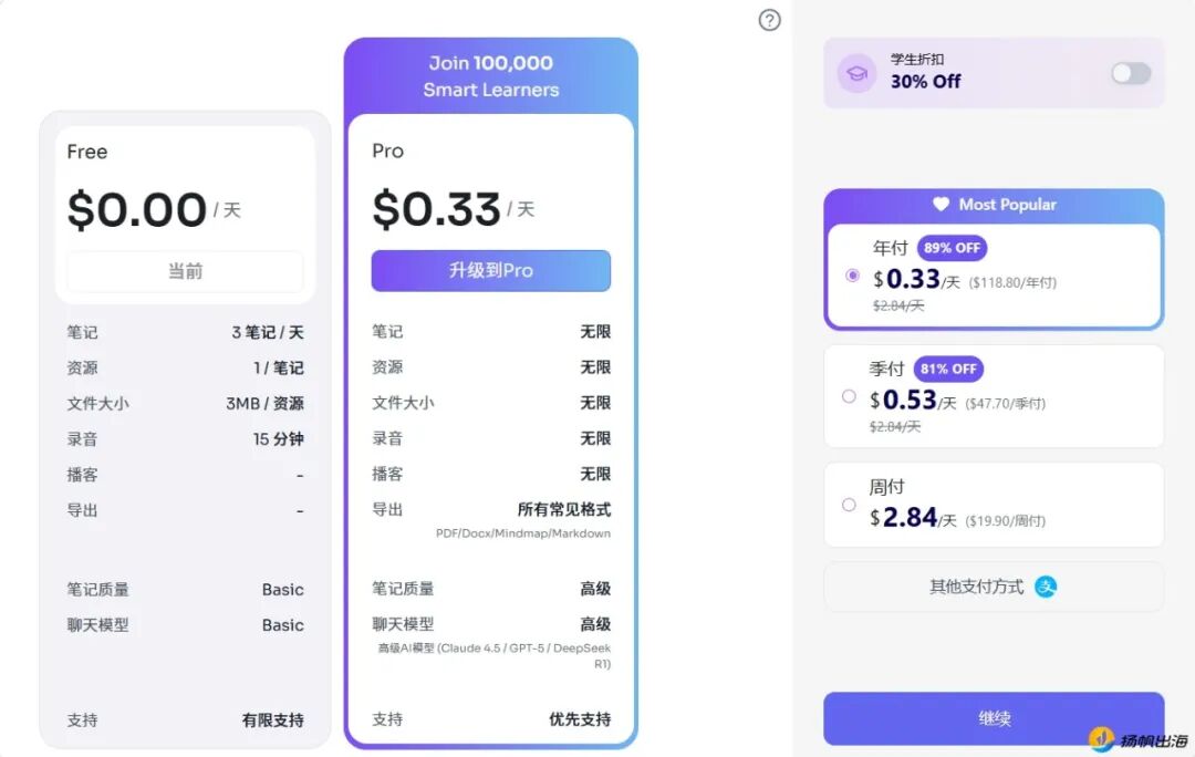 在以学习笔记与课程内容为核心的使用场景下,平台也围绕学生的使用频率与付费能力,设置了相对明确的免费与订阅边界。