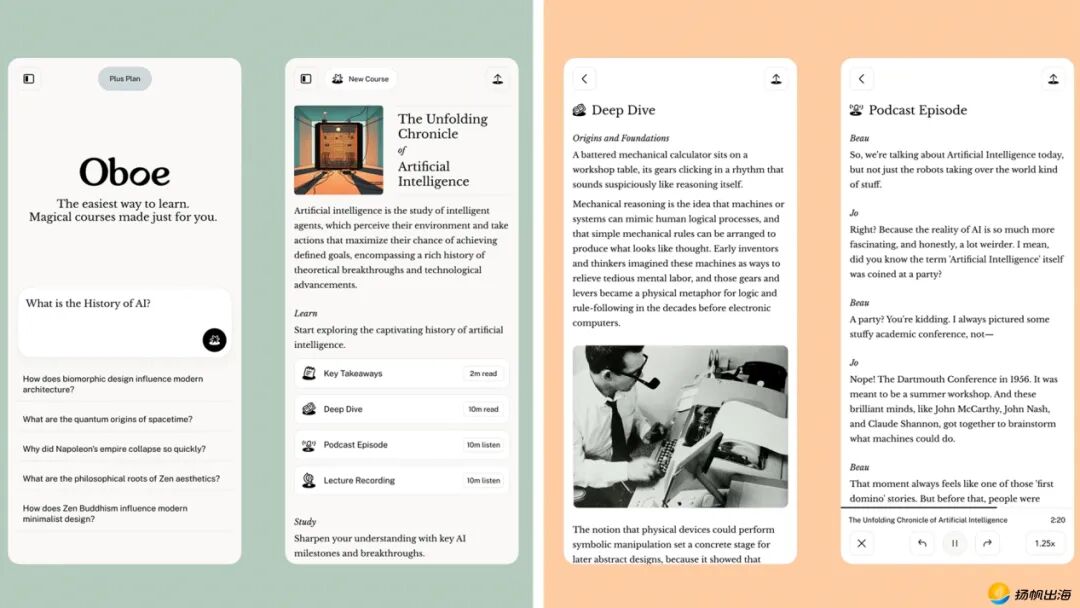 在全球AI学习领域,除了ThetaWave AI之外,Oboe同样值得关注。Oboe由Nir Zicherman和Michael Mignano联合创立,两人曾共同创办播客制作工具Anchor,据TechCrunch报道,Anchor最终被Spotify以约1.4亿美元的价格收购,这段经历为他们此后再次创业积累了产品与业务经验。