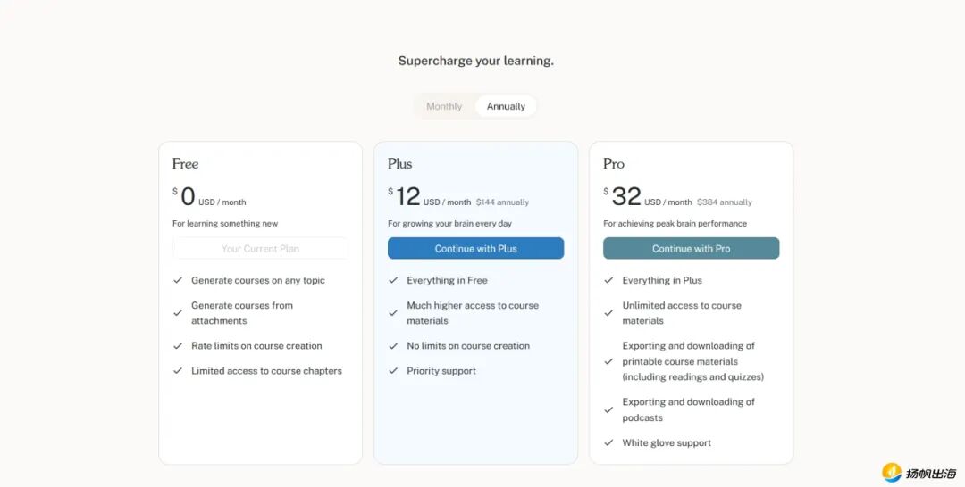 在付费结构上,Oboe采用分层订阅模式。新用户可以在免费层级下每月创建最多5门课程并体验公开内容;订阅付费后,用户可以选择每月12美元的Plus方案,获得最多30门课程的创作权限;或者选择每月35美元的Pro方案,可生成最多100门课程并支持课程导出和离线使用等功能。