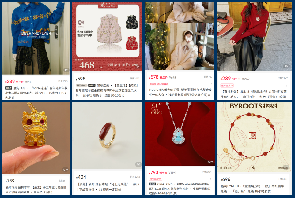 当然,除了这些低客单价的小摆件、装饰、红包外,新年属性情绪驱动不止“便宜好看”的产品,还包含犒劳自己、送礼体面、穿搭焕新、仪式感营造等其他中高客单产品的需求。