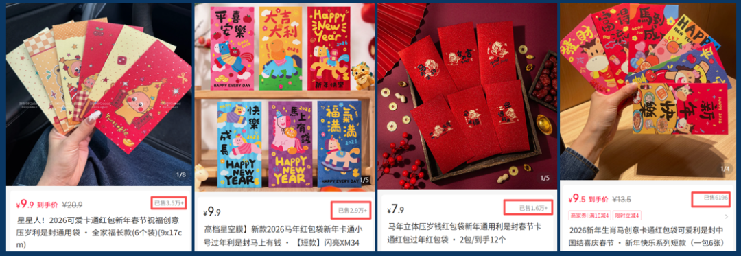 以【马年生肖IP+创意颜值+节日社交】为核心卖点,主打春节包压岁钱、送礼场景,客单价集中在7.90-9.90元,属于典型的“低客单价、高复购、强节日绑定”刚需品。