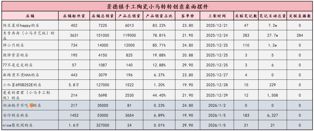 无论12月还是1月,笔记数量多的店铺,产品销量都远高于同时间段笔记少或无笔记的店铺,且堆量+直播的组合(如青青冉冉的店)会进一步放大效果。