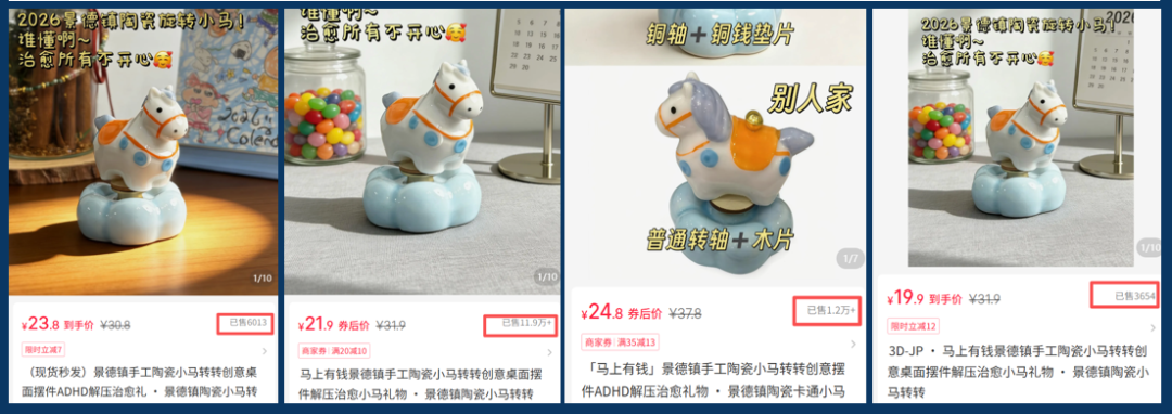 例如:青青冉冉的店、胖小只的店均在12月前后上架多款马年产品,最终仅“景德镇陶瓷小马转转”脱颖而出成为爆款。