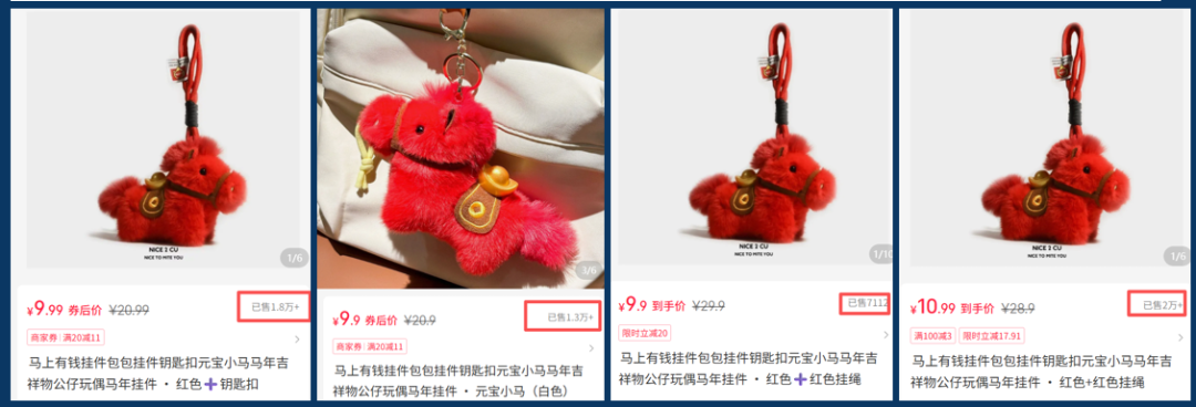 同样,超过10家店铺已上架这款“元宝小马挂件”,形成了多个独立销售链接。且部分店铺拿到了较高的销量。