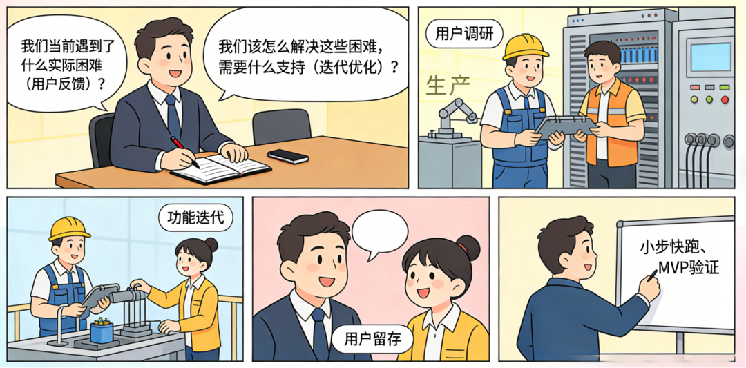 他亲自扎根生产一线(用户调研),和员工一起排查生产隐患、优化生产流程(功能迭代);主动倾听员工诉求,调整薪酬福利,解决员工后顾之忧(用户留存);根据企业实际制定目标,不贪大求全,只要求员工脚踏实地做好每一件事(小步快跑、MVP验证)。