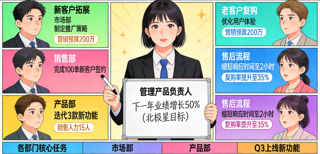 比如,企业提出“下一年业绩增长50%”,这不是口号,而是北极星目标;作为“管理产品负责人”,管理者需要像产品经理拆解需求一样,拆解这个目标:业绩增长来自新客户拓展还是老客户复购?新客户拓展需要市场、销售、产品部门如何配合?需要投入多少营销预算、配备多少销售人力?老客户复购需要优化哪些产品服务、完善哪些售后流程?每一个部门、每一个岗位的核心任务是什么,考核指标是什么,完成时限是什么?