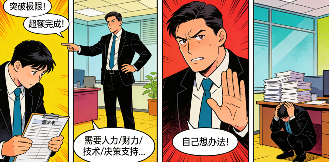 这就像产品经理要求研发团队“一周内完成核心功能迭代”,却不配备足够的研发人力、不明确需求优先级,最终只能导致需求延期、团队内耗——管理者既要业绩亮眼,又要成本可控,还要零失误,却不提供任何资源支持,本质上就是“既要产品好用,又不投入研发资源”,最终所有的压力与责任,都只能由一线员工(产品执行层)承担。