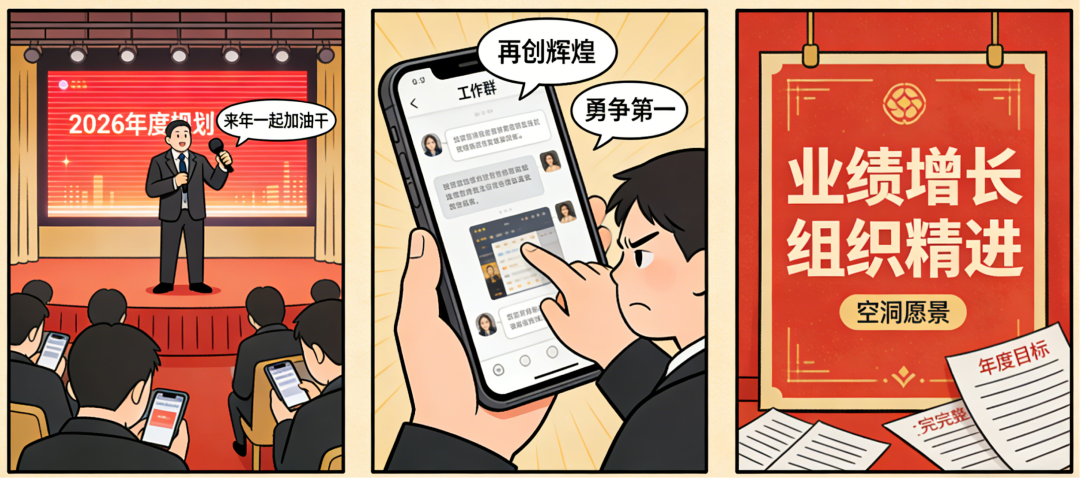 2026年农历新年将至,各大企业陆续进入年会复盘、年度规划的关键周期。如同产品迭代中常见的“伪需求宣讲”,不少企业的管理场景里,“口号”正成为泛滥的“表面动作”——年会舞台上的激昂口号、工作群里的刷屏号召、品牌宣传中的空洞愿景,“来年一起加油干”、“再创辉煌”、“勇争第一”之类的表述,仿佛只要反复宣讲,就能自动转化为业绩增长、组织精进。