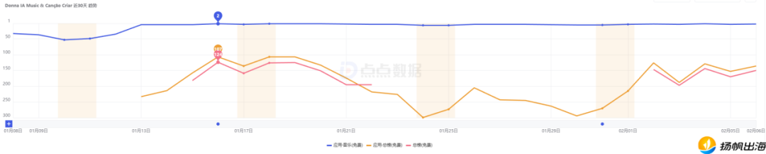 由此可见,Donna的目标群体主要集中在欧美和拉美,特别是拉美这个酷爱音乐的新兴市场,已成为产品发力投放和布局的重点。点点数据显示,应用在2026年1月一度进入超越YouTube和同类应用Suno进入巴西音乐应用榜Top2的位置(Top1为Spotify)。
