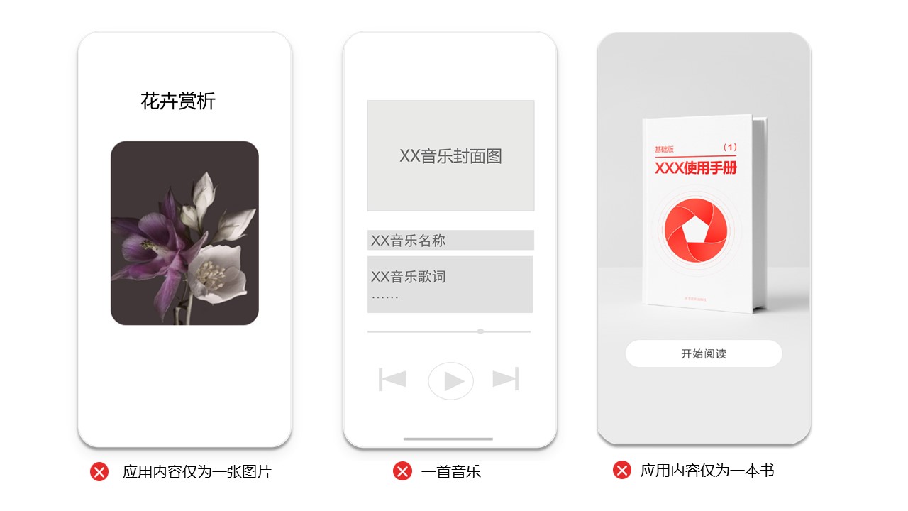 问题4:单一H5/Web页面应用不收录,如一张图片,一首音乐、一本书、一个主题、单一影视剧集类、单一非官方游戏攻略类等。