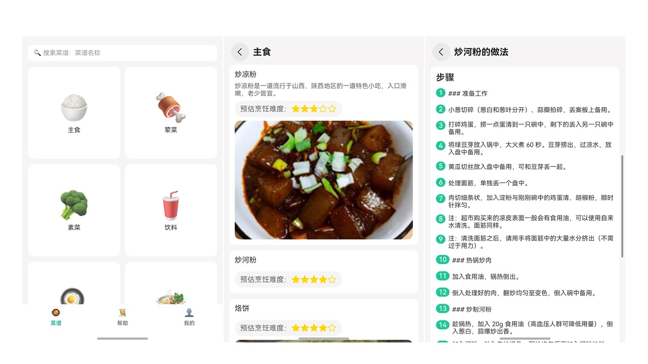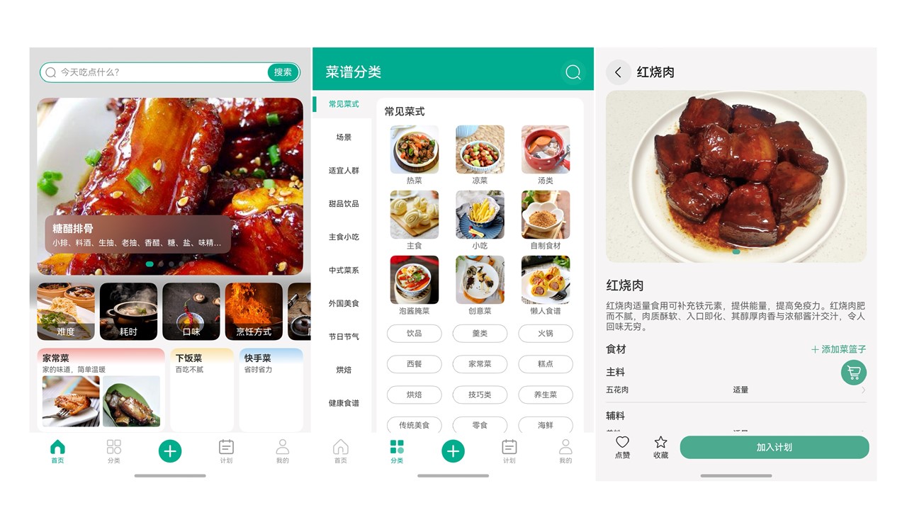 优化后:丰富应用核心功能,新增“做饭计划、上传菜谱、菜篮子”等模块,满足多种用户使用场景,优化整体界面设计展示,凸显菜品,使应用具有实用性的同时更加美观。
