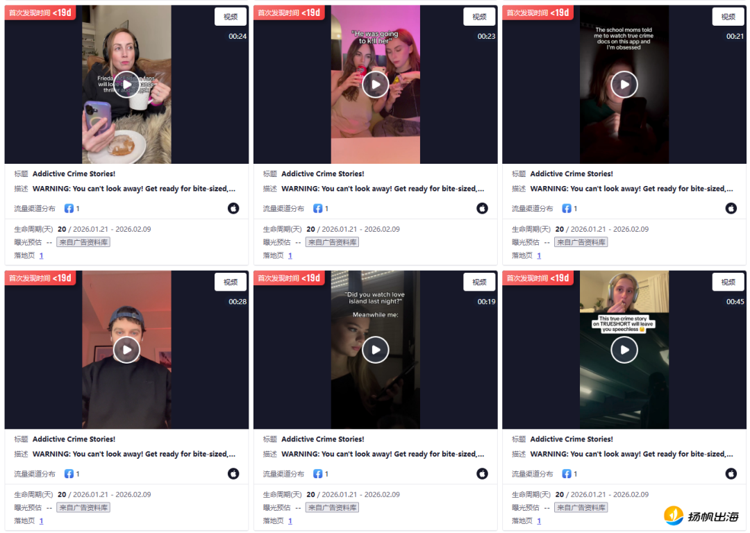 因此,TrueShort选择了一个大胆且令人意想不到的路径——纪实犯罪。它将真实的犯罪案件如神秘失踪、谋杀案等进行了影视化改编,以类似纪录片的方式,做成了20集左右的短剧,每集仅有60秒左右,剧情节奏高度紧凑。也就是说,观众可以在约20分钟时间,看完一个案件从头到尾的全过程。