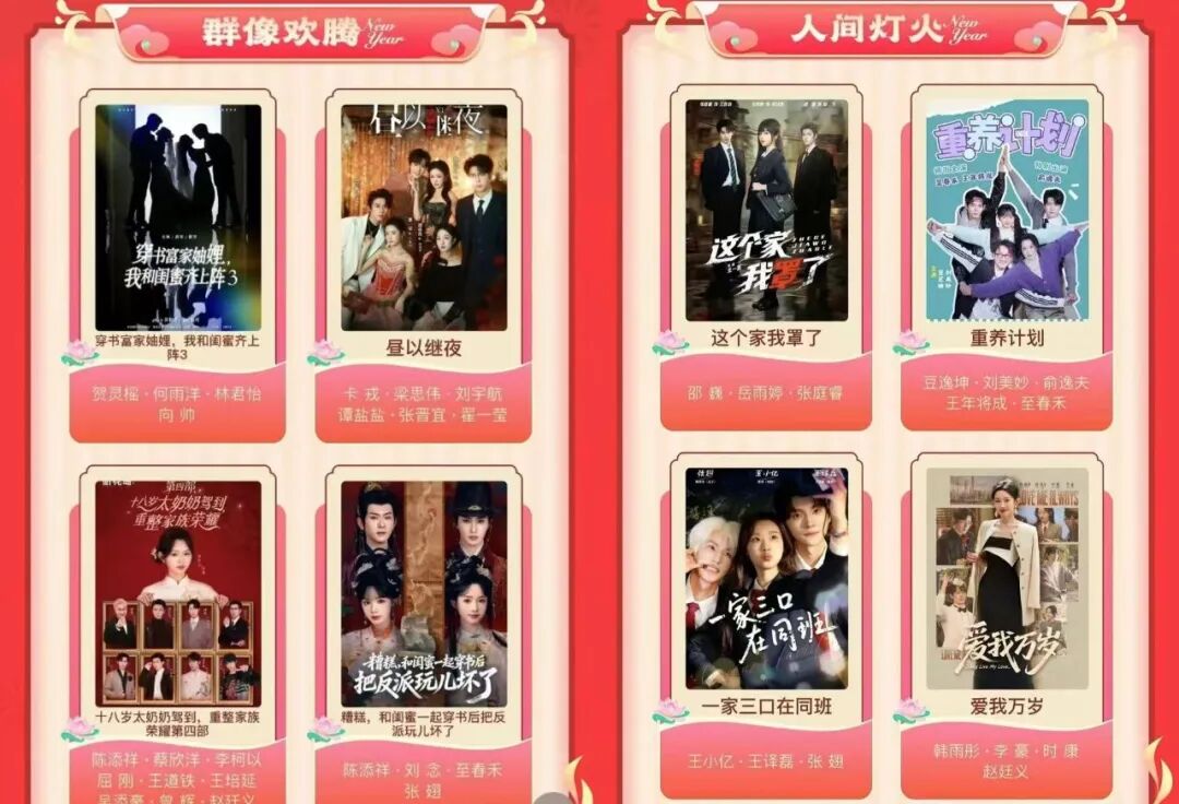 往年春节,剧集市场都能跑出一部年代群像剧爆款,满足阖家共赏的内容消费需求。今年,红果短剧则希望从长剧手中夺过“接力棒”。春节档主打的首个板块就是“群像欢腾”,将会密集上线《穿书富家妯娌2》《十八岁太奶奶驾到4》《糟糕,和闺蜜一起穿书》《昼以继夜》等多部“众星云集”的群像剧。