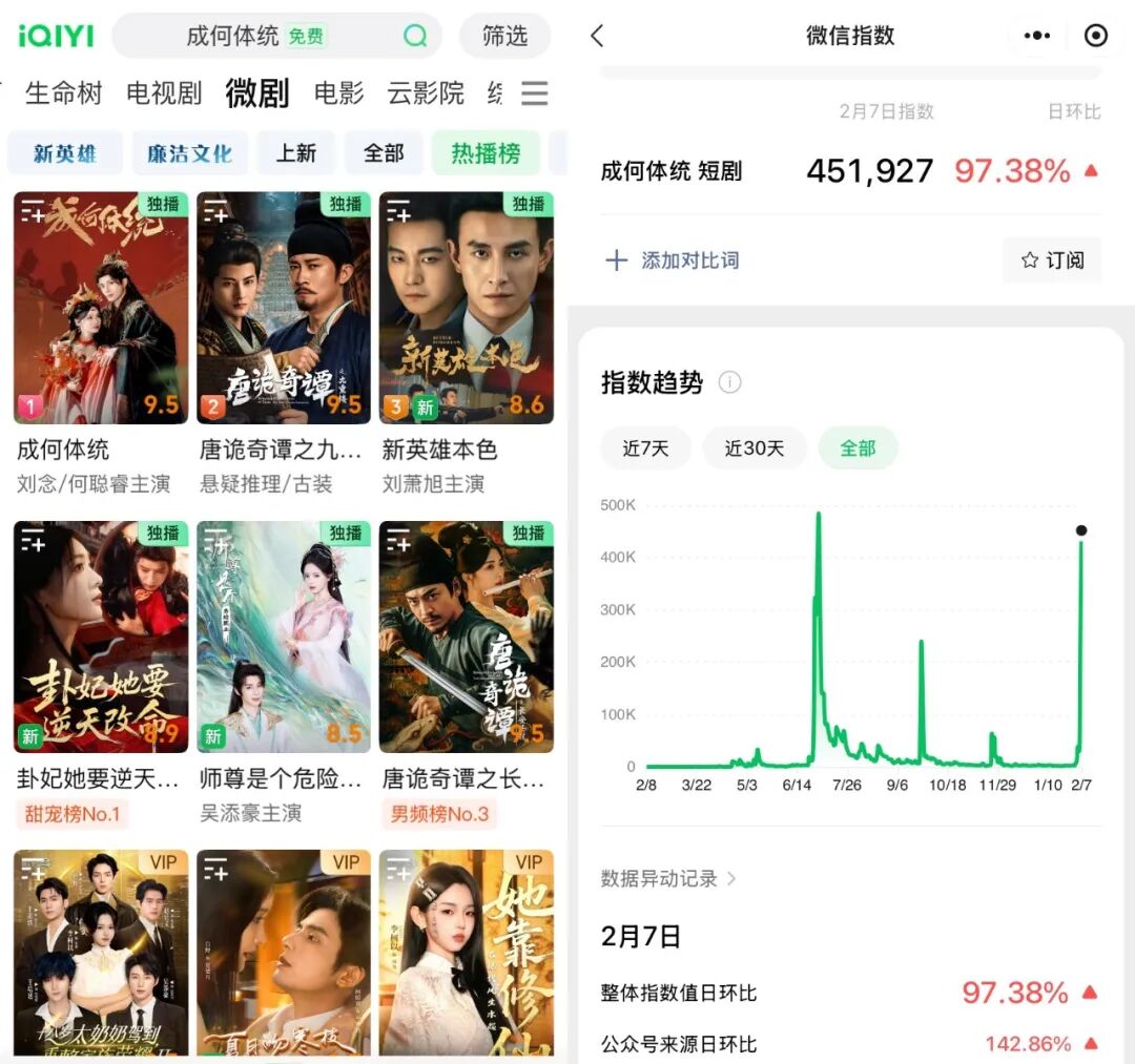 上线才三天,剧集《成何体统》在爱奇艺的热度就突破9000,并有望在春节期间继续突破。这个热门女频IP曾先后改编过动漫、短剧,在剧集热播的同时,《成何体统》短剧版也冲到了爱奇艺微剧热播榜榜首,微信指数直线飙升,直逼去年6月首次开播之时。
