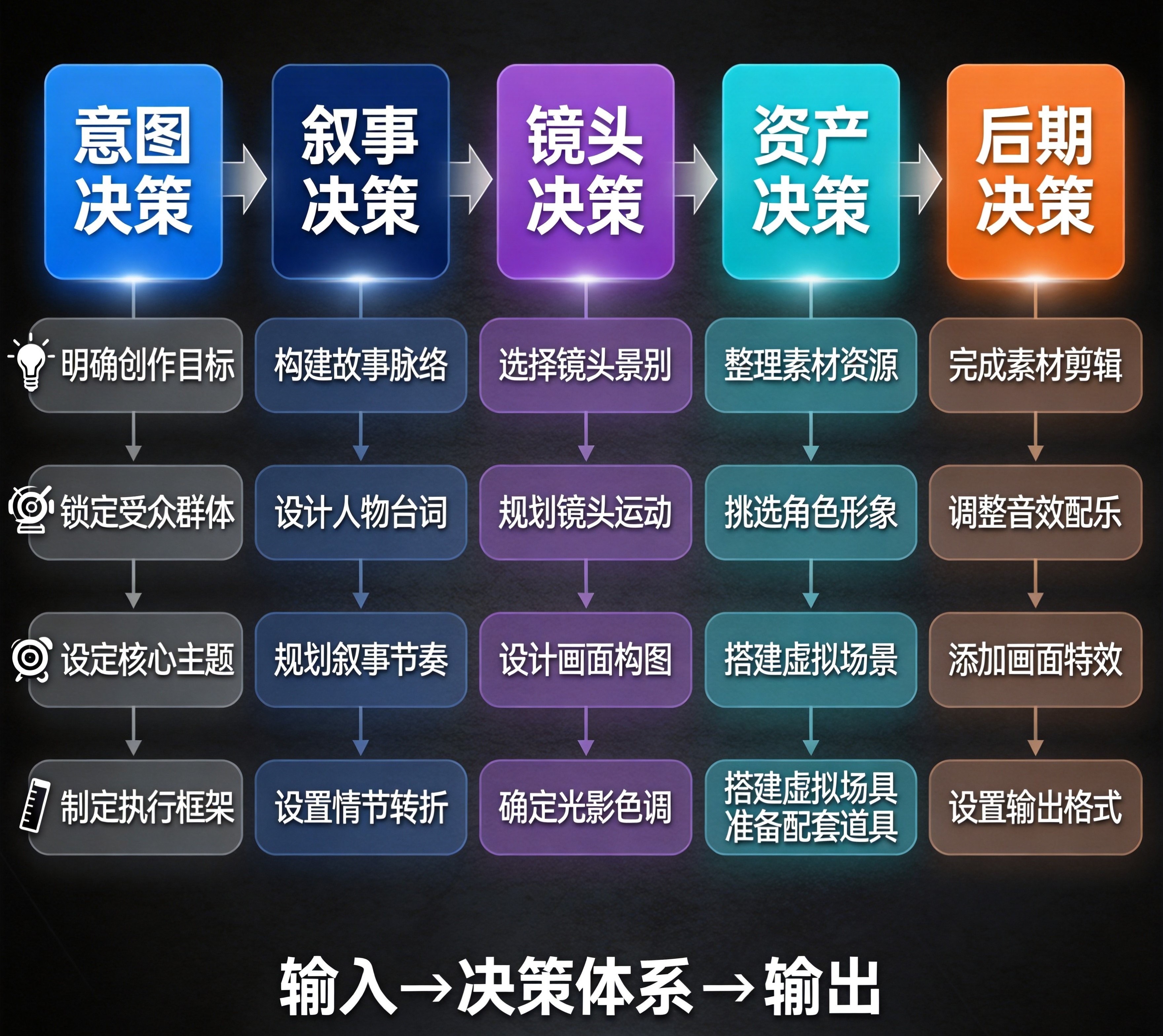 很多人对导演工作的理解,停留在一句话描述画面,比如一个帅哥在雨夜奔跑,光影昏暗,镜头跟着人移动。但真正的导演创作,本质是一套结构化的决策过程,包含五大核心环节,这也是Seedance2.0的底层逻辑: